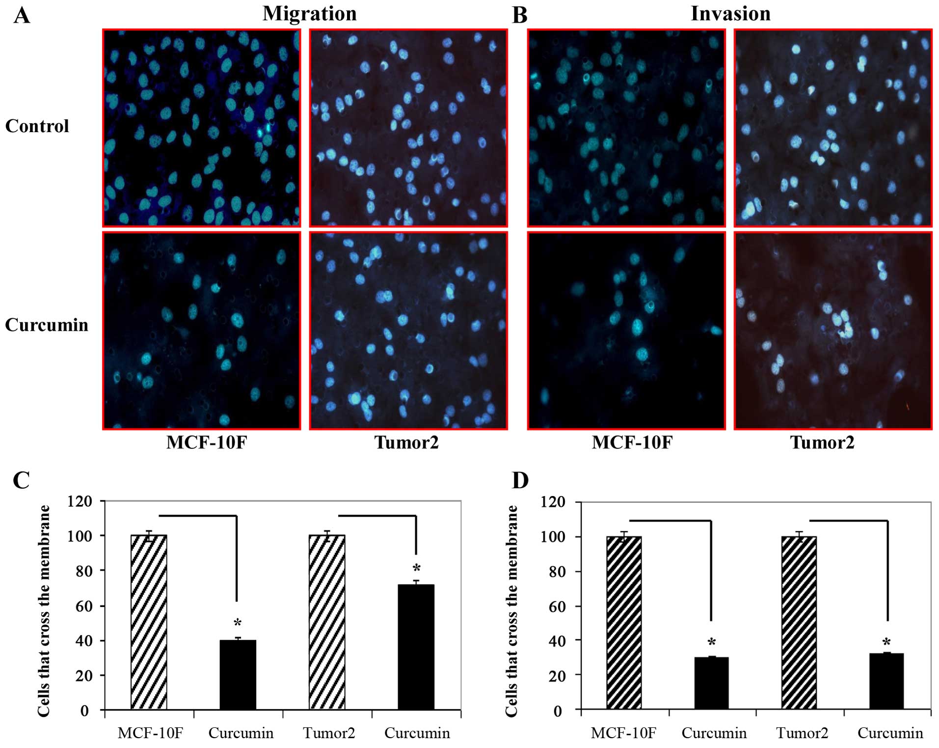 Curcumin induced a reduction of tumor cell invasion and metastasis along with apoptosis. The motile phenotypes of cells treated with curcumin were evaluated by migration and invasion assay. After treatment with curcumin the number of migratory and invasive cells decreased significantly compared to the untreated cells. Curcumin has been reported to inhibit cell proliferation and promote accumulation of cells in the G2/M phase of the cell cycle (75).