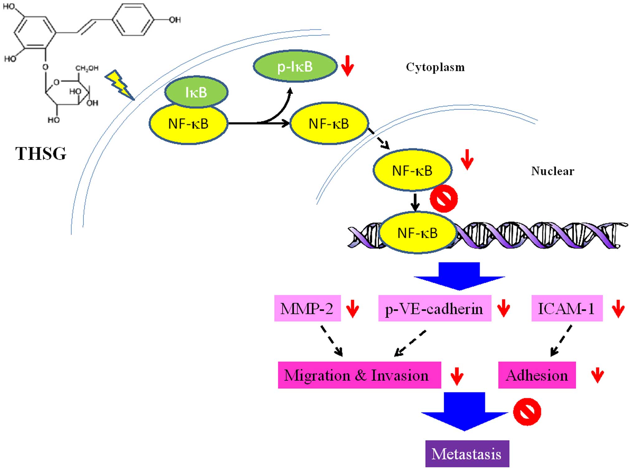 In conclusion, as shown in Fig. 8, our results support a model in which THSG suppresses CRC cell metastasis. THSG significantly altered the expression of specific migration-related genes, e.g., MMP-2 and ICAM-1, via the downregulation NF-κB activation, resulting in inhibited migration, invasion and adhesion by HT-29 and EA.hy926 cells. Thus, THSG may reduce the metastatic ability of colon cancer cells. In HT-29 cells, the mechanisms of action of THSG may involve the inhibition of cell migration, adhesion, intravasation and extravasation, as well as the regulation of protein expression. THSG might serve as a potential anti-metastatic agent.