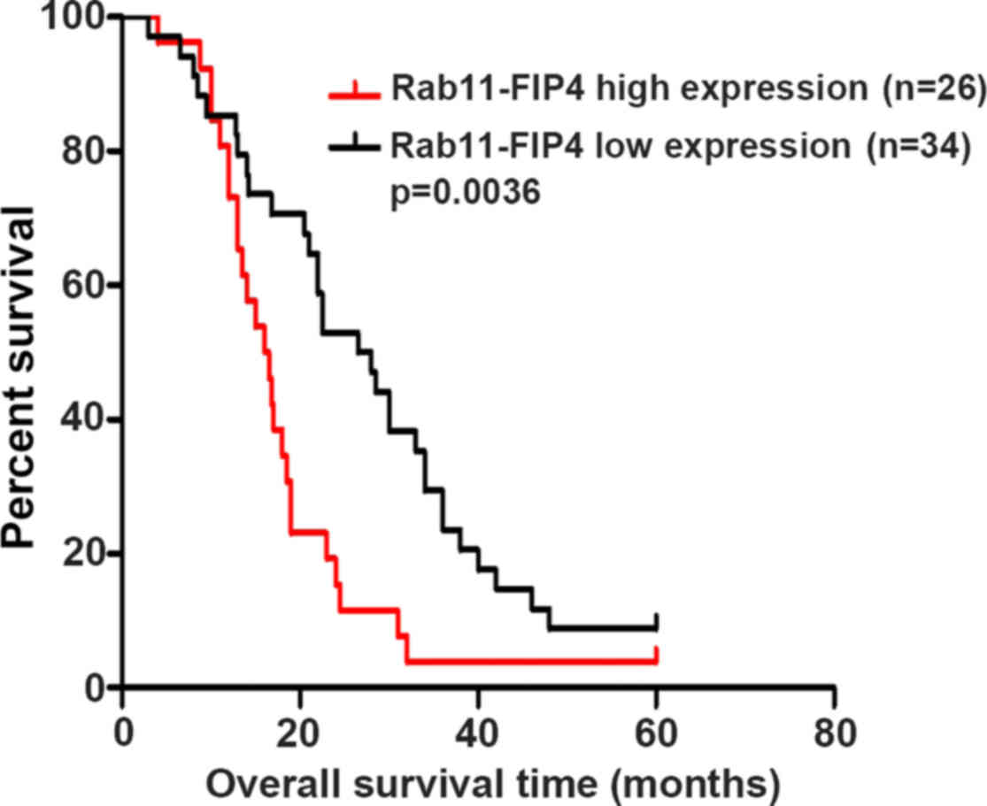 We studied whether Rab11-FIP4 overexpression was related to the overall survival of PC patients. The sixty PC patients were divided into two groups according to the immunohistochemical results. The overall survival time of high Rab11-FIP4 expression group was (16.4±5.9) months, while it was (28.5±12.7) months in low Rab11-FIP4 expression group. The results indicated that patients with low Rab11-FIP4 expression had much longer OS times (P=0.0036) (Fig. 2).