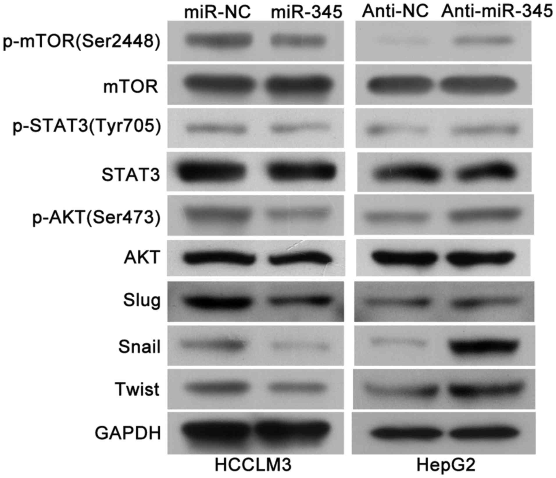 As previous research has identified that IRF1 activated mTOR/STAT3/AKT signaling and subsequently upregulated Slug, Snail and Twist, which could promote HCC cell migration, invasion as well as EMT process (15) and we continued to explore whether mTOR/STAT3/AKT signaling axis is involved in the miR-345/IRF1 mediated EMT process. Of note, we found that the levels of phosphoryated mTOR, STAT3 and AKT as well as Slug, Snail and Twist were remarkably decreased in the miR-345 overexpression group while miR-345 knockdown lead to increased activity of mTOR/STAT3/AKT signaling pathway and its downstream targets (Fig. 8). Therefore, these results indicated that mTOR/STAT3/AKT signaling axis might be involved in the miR-345/IRF1 mediated EMT process in HCC.