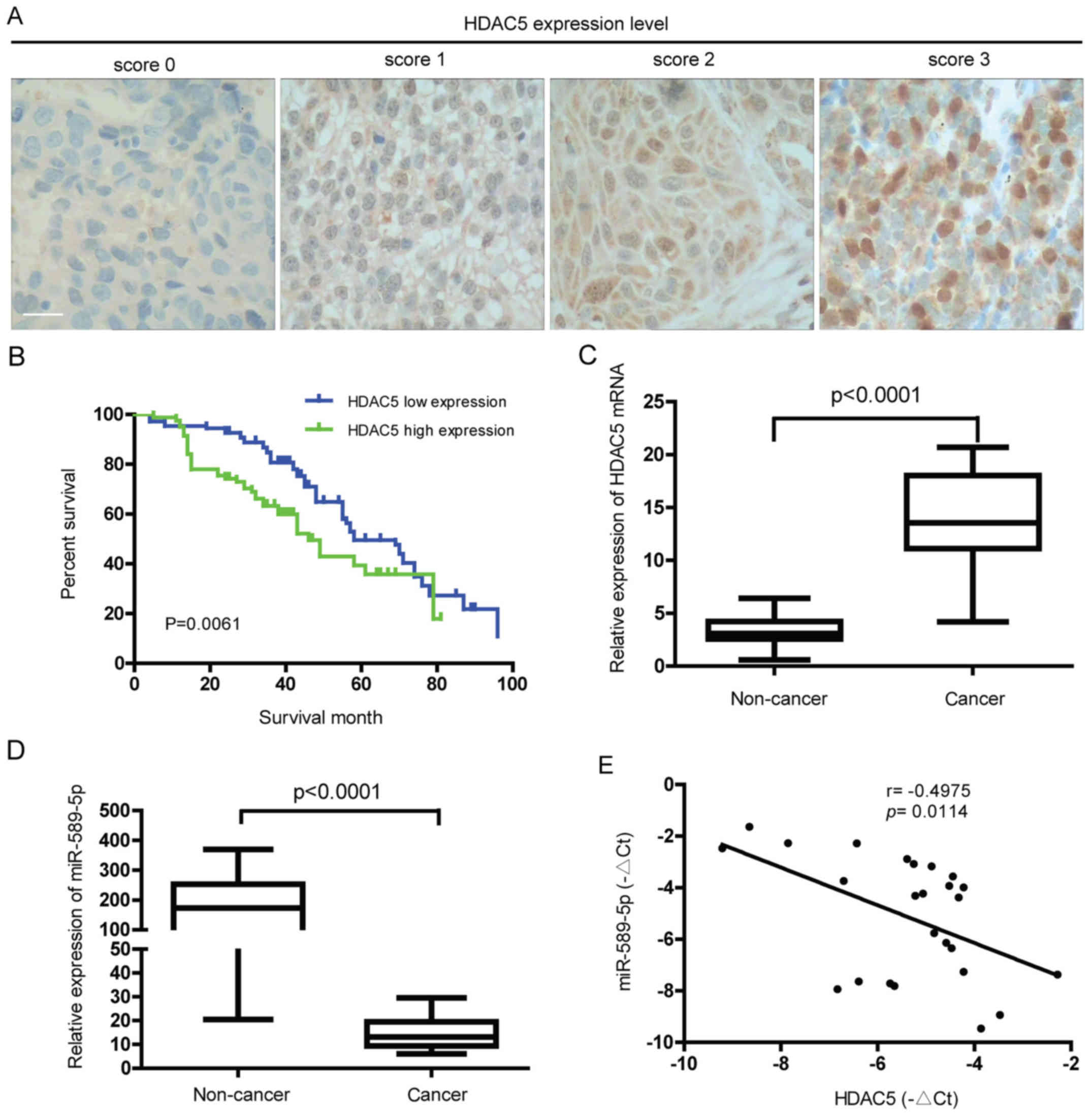 The study was performed with the approval of the Ethics Committee of The First Affiliated Hospital of Xi'an Jiaotong University and the Second of Dalian Medical University. NSCLC tissues were collected by needle biopsy or surgery from 190 patients at The First Affiliated Hospital of Xi'an Jiaotong University (Xi'an, China) and The Second of Dalian Medical University (Dalian, China) from 2008 to 2010. All specimens were fixed in 10% neutral formalin, embedded in paraffin and cut into 4-µm sections for immunohistochemical staining. The EnVision™ two-step method was used (Dako, Hamburg, Germany), as well as the following antibody: antibody against HDAC5. To estimate the score for each slide, at least 10 individual fields at 200X were chosen, and 100 cancer cells were counted in each field. The immunostaining intensity was divided into four grades: 0, no expression; 1, mildly positive; 2, moderately positive; and 3, markedly positive. The proportion of positive-staining cells was divided into five grades: 0, <10%; 1, 11–25%; 2, 26–50%; 3, 51–75%; and 4, >75%. The staining results were assessed and confirmed by two independent investigators blinded to the clinical data. The percentage of positivity of the tumor cells and the staining intensities were then multiplied in order to generate the IHC score, and graded as 0–6, low expression; 7–12, high expression. Cases with a discrepancy in scores were discussed to obtain a consensus.