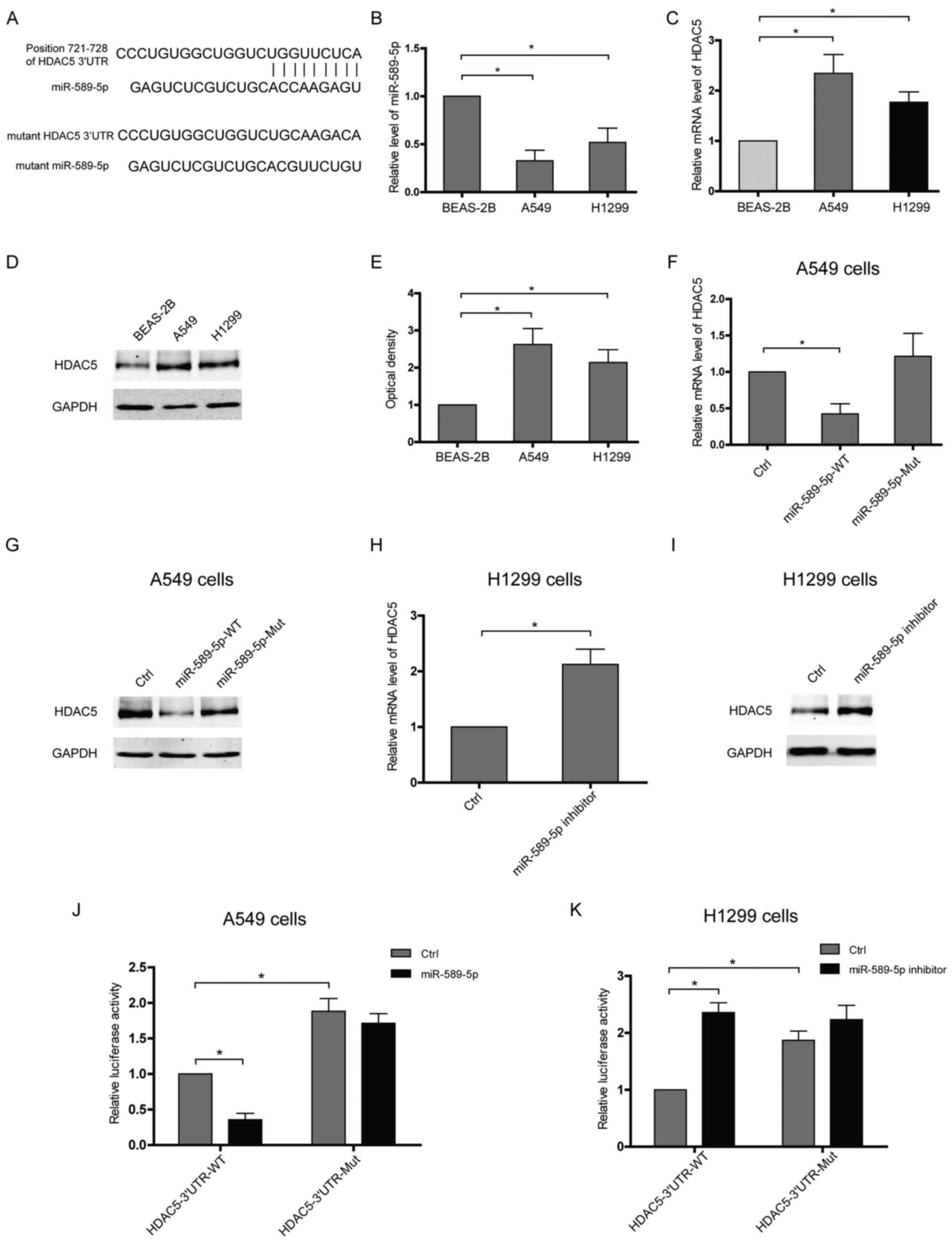 To verify HDAC5 as a target of miR-589-5p, software TargetScan was applied to predict putative interaction and a possible binding site within the 3′UTR of HDAC5 was found to hybridize with miR-589-5p (Fig. 2A). Furthermore, the expressions of miR-589-5p and HDAC5 in lung epithelial or NSCLC cells were examined. Upregulation of HDAC5 accompanied with decreased miR-589-5p was observed in NSCLC cells compared with lung epithelial cells (Fig. 2B–E). The expressions of HDAC5 at both mRNA and protein level were attenuated in NSCLC cells transfected with wild-type miR-589-5p, but not with the mutant (Fig. 2F and G). Knockdown of miR-589-5p in lung epithelial cells using an anti-miRNA inhibitor specific for miR-589-5p resulted in a significant upregulation of HDAC5 (Fig. 2H and I). To determine whether HDAC5 is directly targeted by miR-589-5p in NSCLC, HDAC5 3′UTR fragment containing a wild-type or mutant binding site was cloned into luciferase reporter vector and the inhibitory effect of miR-589-5p was measured by luciferase activity. It was found that the lucif-erase signal of wild-3′UTR was reactively decreased by miR-589-5p, but the mutant was not (Fig. 2J). Consistently, only the luciferase reporter with intact 3′UTR was responsive to miR-589-5p inhibitor (Fig. 2K). Hence, these data indicate that miR-589-5p negatively regulates HDAC5 expression via targeting the 3′UTR of HDAC5 mRNA.