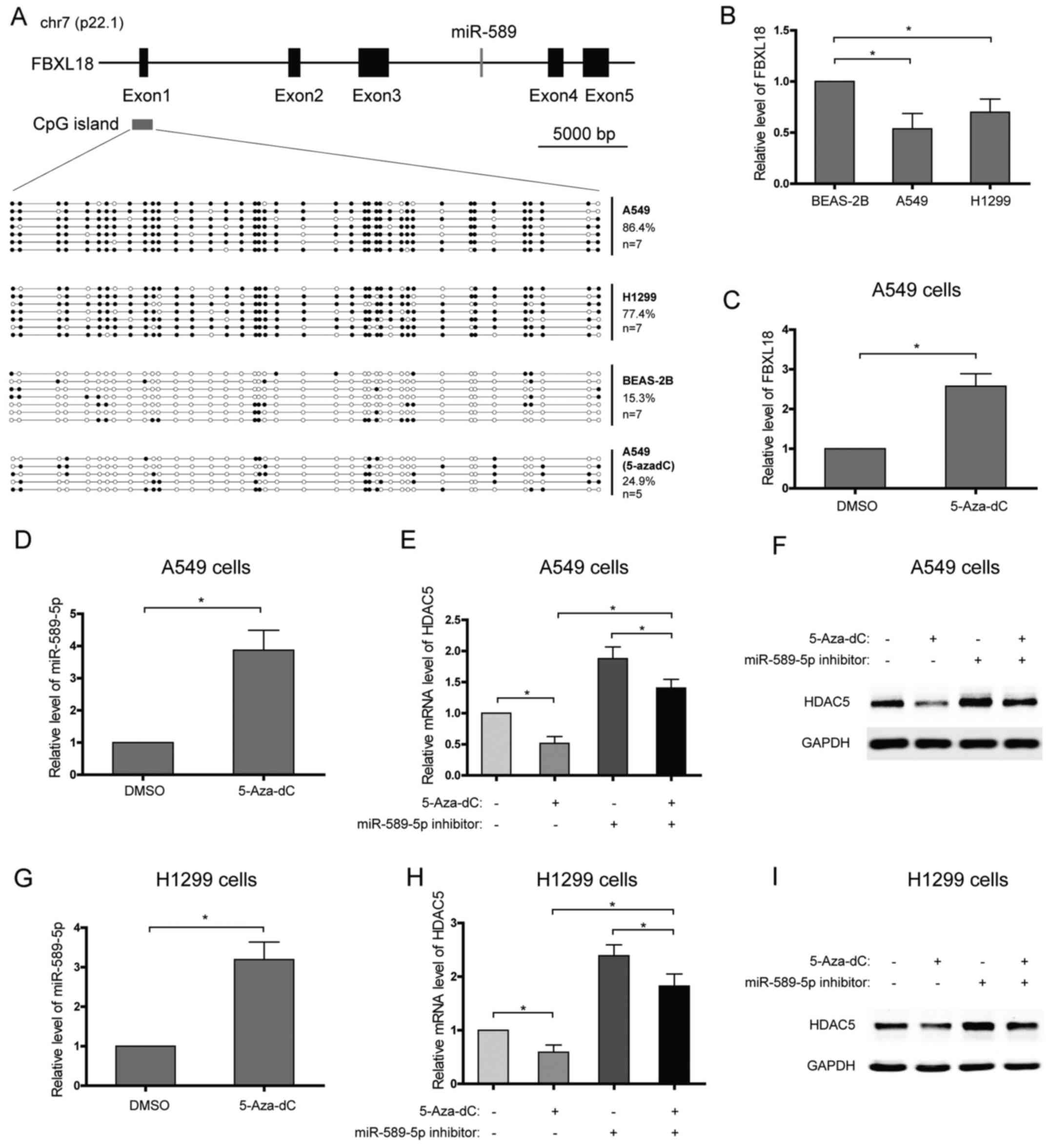 miR-589 is an intronic microRNA which is located at 7p22.1 and within intron 3 of the F-Box and leucine rich repeat protein 18 (FBXL18) gene, and they are in the same transcriptional direction (Fig. 3A). Further analysis showed that the expression patterns of miR-589 and its host gene, FBXL18, in NSCLC cell lines or after 5-Aza-dC treatment seemed to be similar, which suggested that they may share the same promoter (Fig. 3B–D). In order to characterize the DNA meth-ylation profile of the FBXL18/miR-589 gene promoter, DNA bisulfate conversion coupled to sequencing was performed in NSCLC and lung epithelial cells. A CpG island was predicted using UCSC genome browser and focused on (Fig. 3A). High DNA methylation levels of the CpG island, with 86.4% of methylated CpGs in A549 cells and 77.4% in H1299 cells, were detected with DNA bisulfate conversion (Fig. 3A). In contrast, low DNA methylation level, with 15.3% of methylated CpGs, was found in the lung epithelial BEAS-2B cells (Fig. 3A). To confirm that the promoter hypermethylation of the miR-589 gene enhances the transcriptional repression of miR-589-5p and then increases HDAC5 expression, NSCLC cells were treated with DNA methylation inhibitor, 5-Aza-2′-deoxycytidine (5-Aza-dC), and the expression of HDAC5 was analyzed. The results showed that >60% of the CpGs were demethylated in A549 cells treated with 5-Aza-dC (Fig. 3A). In line with this, miR-589-5p level was found to increase after 5-Aza-dC treatment (Fig. 3D and G). As expected, 5-Aza-dC observably suppressed the expression of HDAC5 in NSCLC cells, while miR-589-5p specific inhibitor weakened the suppression (Fig. 3E, F, H and I). Therefore, these findings suggest that silence of miR-589-5p in NSCLC is due to DNA hypermethylation.