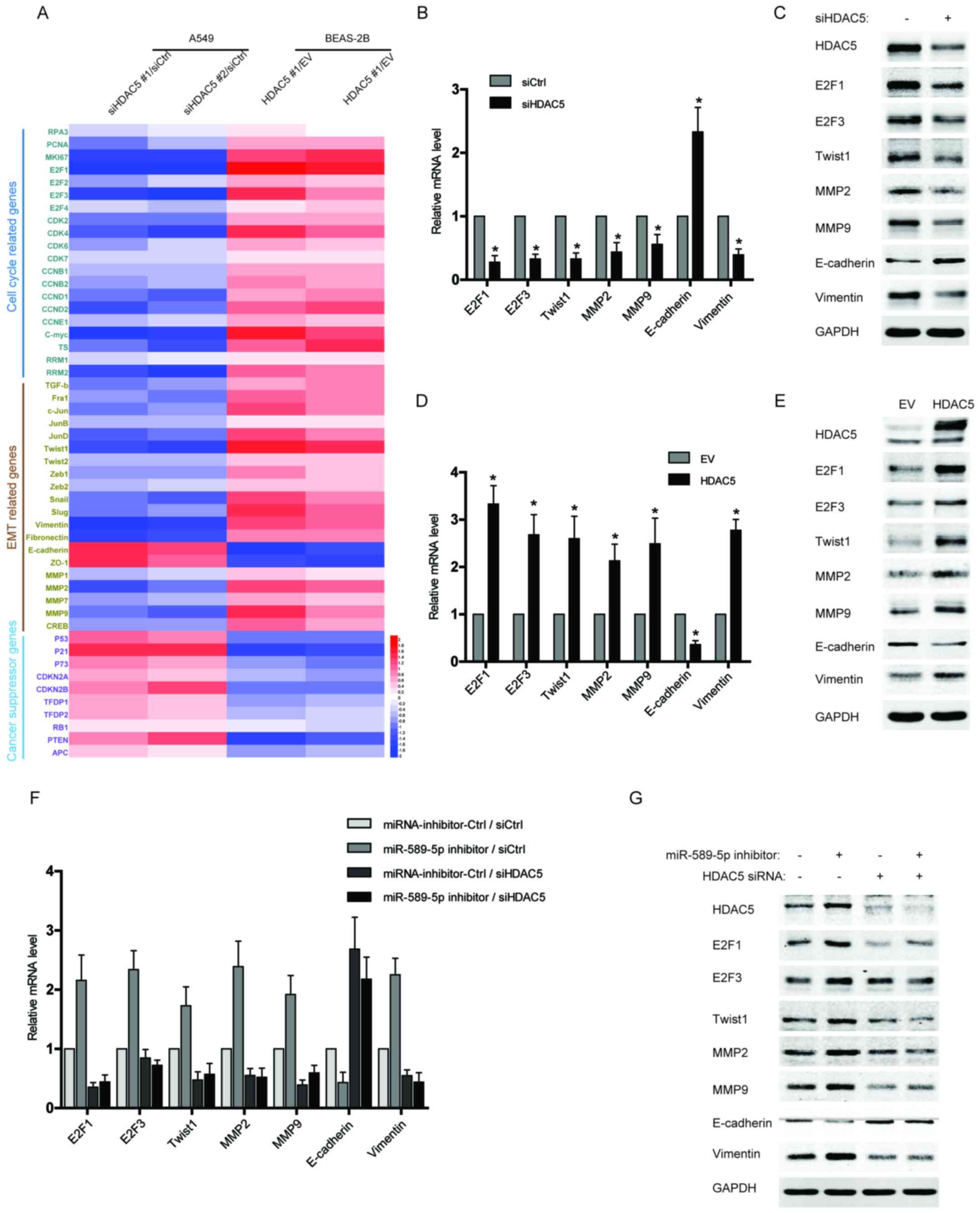 Since HDAC5 has been reported to play a crucial role in tumor progression and metastases, we examined the expression of several gene clusters associated with cell cycle and EMT by qPCR array. As shown in Fig. 4A, the data from qPCR array revealed that multiple cell cycle or EMT drivers, especially E2F1, E2F3, Twist1, MMP2, MMP9, and Vimentin, were robustly increased in the BEAS-2B cells with HDAC5 overexpression, but reduced in HDAC5-silenced NSCLC cells compared with control. Moreover, several tumor suppressor genes were also analysed in the qPCR array, and their expression was repressed by HDAC5 overexpression but activated after HDAC5 knockdown (Fig. 4A). The results of qPCR array were further confirmed by independent qPCR and western blotting (Fig. 4B–E). To determine the significance of miR-589-5p/HDAC5 pathway in regulating cell proliferation and EMT, the expressions of the above factors were examined in the NSCLC cells transfected with miR-589-5p inhibitor and HDAC5 siRNA. It was found that knockdown of HDAC5 completely reversed the promotive effect of miR-589-5p inhibitor on the expression of cell cycle or EMT drivers (Fig. 4F and G). Therefore, the evidence demonstrates that miR-589-5p/HDAC5 pathway plays a crucial role in regulating the cell cycle and EMT of NSCLC cells.