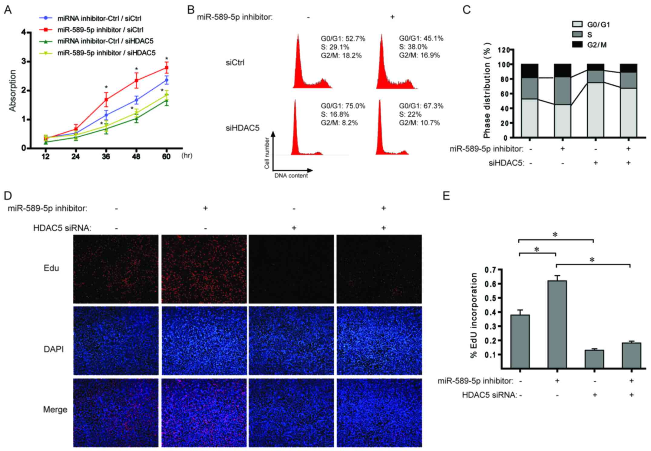 With regard to the data from Fig. 4, the effect of miR-589-5p/HDAC5 pathway on cell proliferation was explored in NSCLC cells. As shown in Fig. 5A, miR-589-5p inhibitor boosted cell proliferation and additional knockdown of HDAC5 completely suppressed the induced proliferation. Cell cycle analysis indicated that inhibiting miR-589-5p led to a significant increase in the ratio of S phase cells, but a decrease after transfection with HDAC5 siRNA (Fig. 5B and C). Similarly, EdU incorporation assay revealed that the percentage of cells with incorporated EdU was significantly increased when treated with miR-589-5p inhibitor; however, knockdown of HDAC5 impaired the effect (Fig. 5D and E). The above results indicate a regulatory role of miR-589-5p/HDAC5 pathway in the proliferation of NSCLC cells.