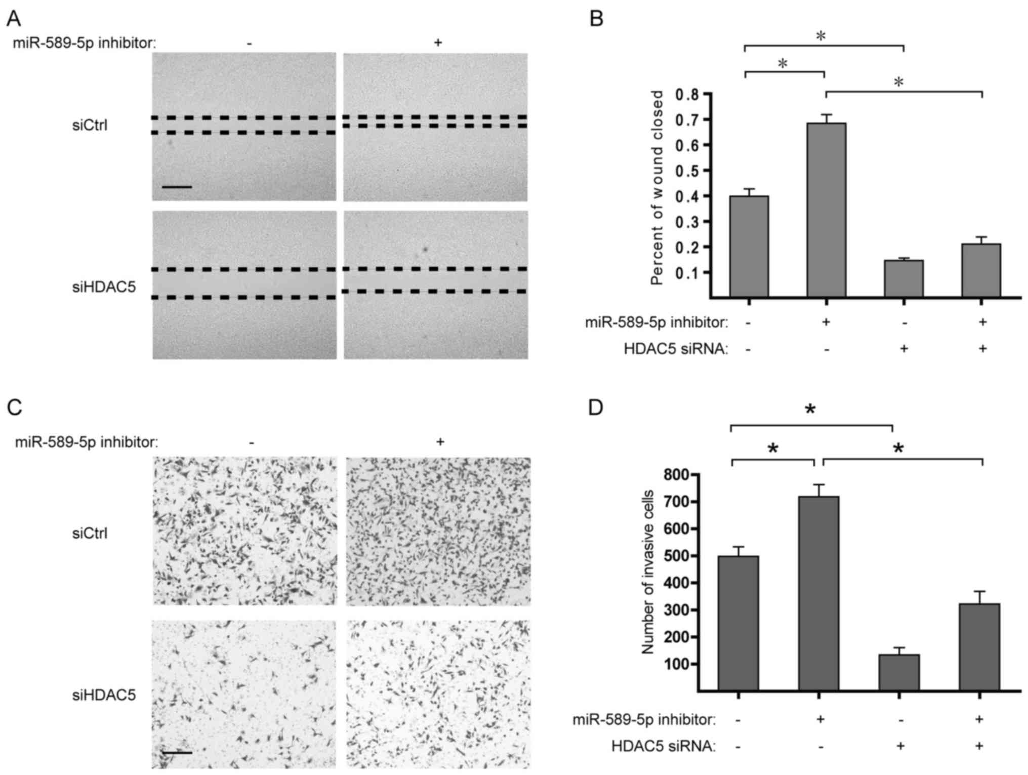 Considering the upregulation of EMT-related genes induced by HDAC5 overexpression, it is worth studying the role of miR-589-5p/HDAC5 pathway in the migration and invasion of NSCLC. It was found that suppression of miR-589-5p markedly strengthened the migratory and invasive capabilities of NSCLC cells, whereas deprivation of HDAC5 determined the reverse in the malignant phenotypes (Fig. 6). Taken together, these findings suggest that deregulation of miR-589-5p/HDAC5 pathway displays a critical role in the migration and invasion of NSCLC.