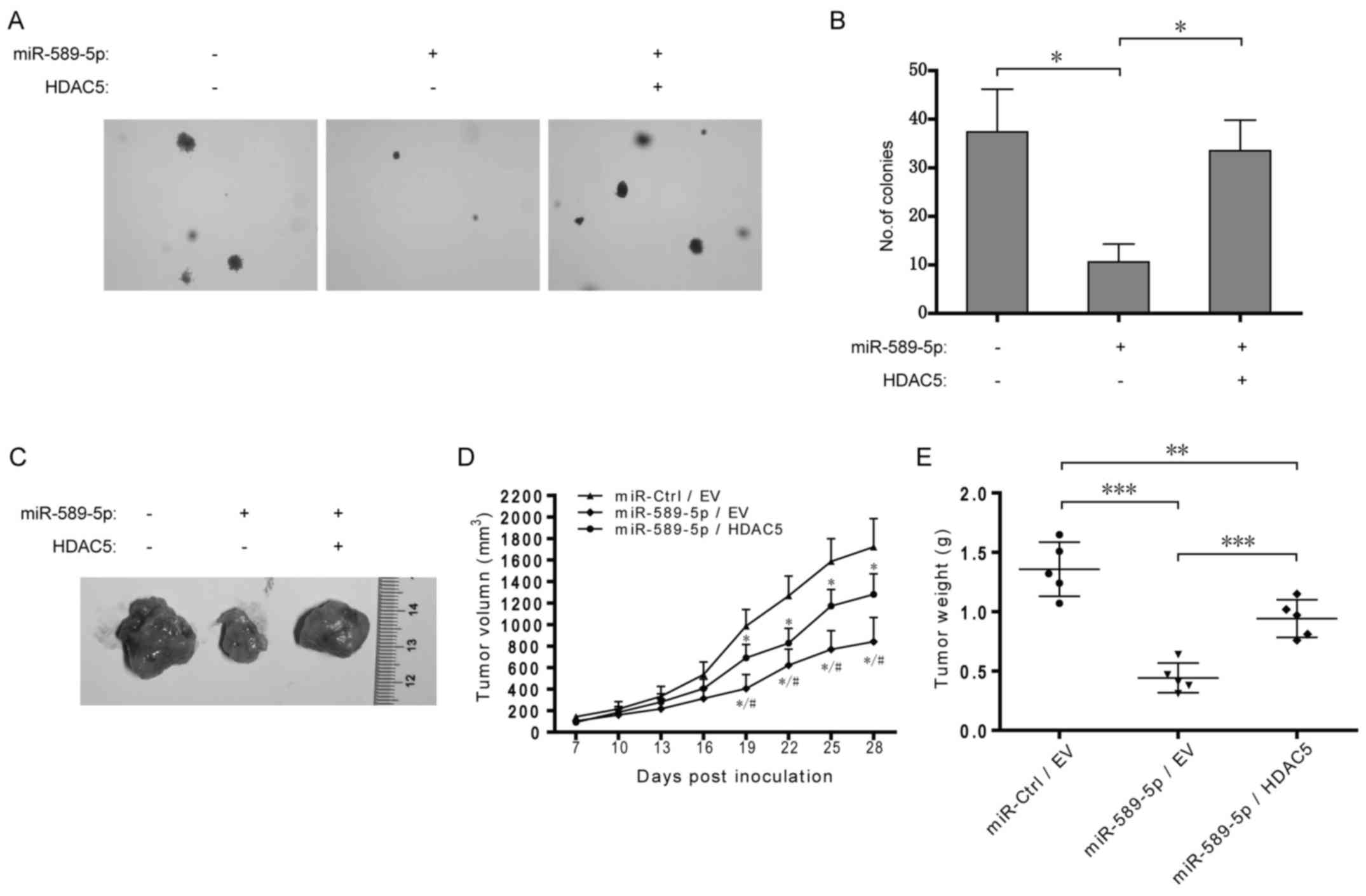 To further determine the role of miR-589-5p/HDAC5 pathway in tumorigenesis, A549 cells with stable overexpression of miR-589-5p and HDAC5 were constructed and then examined by colony formation and xenograft assays. As shown in Fig. 7A and B, overexpression of miR-589-5p resulted in the reduction of anchorage-independent colony formation in soft agar in A549 cells, but additional exogenous HDAC5 rescued the reduction. Xenograft assay demonstrated that overexpression of miR-589-5p significantly decreased A549 xenograft growth in nude mice while simultaneous HDAC5 overexpression partially retrieved the growth (Fig. 7C–E). Taken together, these data indicate a crucial role of miR-589-5p/HDAC5 pathway in NSCLC tumorigenicity in vitro and in vivo.