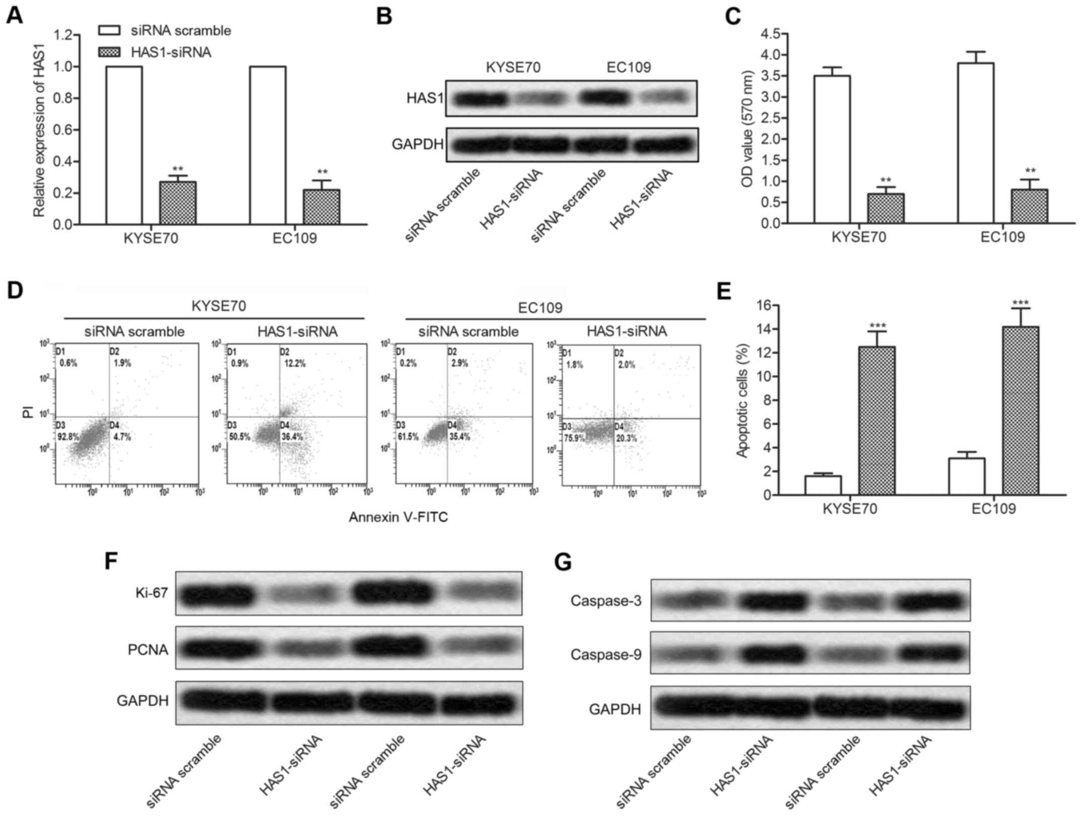 We then tested the functional significance of HAS1 in ESCC cells lines. KYSE70 and EC109 cell lines were transfected with HAS1-siRNA or siRNA scramble, respectively. The expression of HAS1 was successfully reduced by HAS1-siRNA as shown in Fig. 2A and 2B (**P<0.01). Then, the result of CCK8 assay showed that the inhibition of HAS1 largely suppressed cell proliferation in KYSE70 and EC109 cells (**P<0.01, Fig. 2C). Additionally, the effect of HAS1 on cell apoptosis was valued through flow cytometry. The result showed that the rate of apoptotic cells was markedly increased in HAS1-siRNA group compared with the scramble group (***P<0.001, Fig. 2D and E). The expression of cell proliferation and apoptosis related proteins was then detected through western blotting. Decreased expression of proliferation markers Ki67 and PCNA and increased level of apoptosis markers (caspase-3 and caspase-9) further revealed that HAS1-siRNA suppressed cell proliferation and induced cell apoptosis in ESCC cells (Fig. 2F and G). Taken together, the results above strongly suggested that inhibition of HAS1 reduced cell viability in ESCC cells.