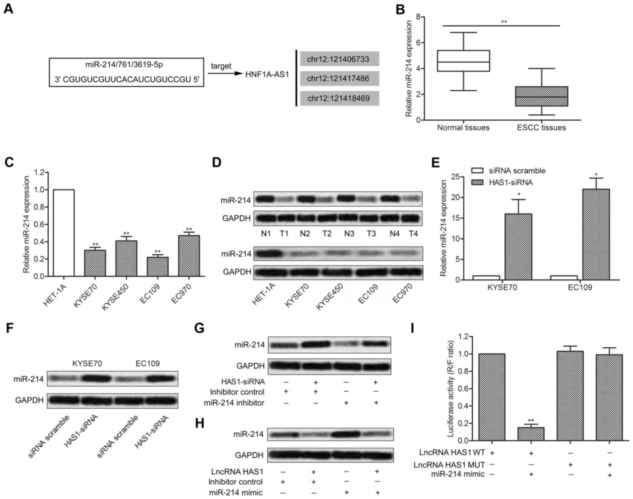 Predicted by bioinformatics analysis, three complementary sites of miR-214 was found in the sequence of HAS1 RNA (Fig. 4A). Besides, in previous research, miR-214 was found downregulated in ESCC and acted as a diagnostic marker and therapeutic target in ESCC (28). A series of experiments were then conducted to explore the relationship between miR-214 and HAS1 in ESCC. The expression of miRNA-214 was significantly decreased in ESCC tissues and cell lines (KYSE70, KYSE450, EC109 and EC9706) compared with normal tissues and esophageal epithelial cell line (HET-1A) (**P<0.01, Fig. 4B and C). Similar conclusion was further verified through northern blot analysis (Fig. 4D). Interestingly, the expression of miR-214 was strongly increased in KYSE70 and EC109 cells transfected with HAS1-siRNA (*P<0.05, Fig. 4E and F). Then, elevated expression of miR-214 was suppressed by miR-214 inhibitor in EC109 cells transfected with LncRNA HAS1 (Fig. 4G). Similarly, decreased expression of miR-214 was upregulated by adding miR-214 mimic in EC109 cells transfected with HAS1-siRNA (Fig. 4H). Luciferase reporter assays showed that relative luciferase activity in LncRNA HAS1 wild-type group was significantly decreased by co-transfecting miR-214 mimic compared with control group (**P<0.01, Fig. 4I). All the results above illustrated the fact that miR-214 was a target of HAS1.