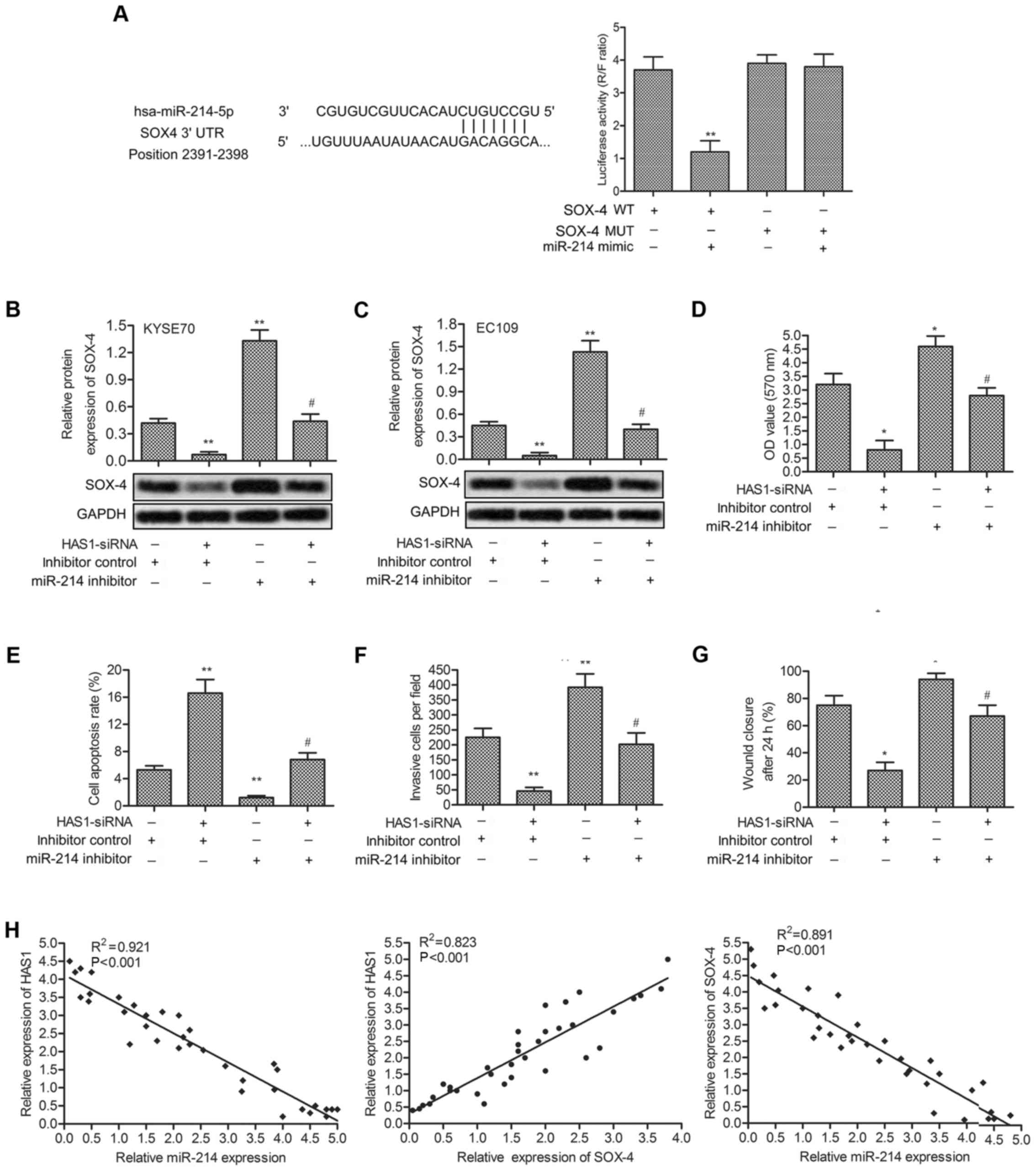 According to previous reports, HAS1 and SOX-4 were both involved in the pathogenesis of ESCC, so it is worth exploring the relationship between the two. KYSE70 and EC109 cells were transfected with HAS1-siRNA and/or miR-214 inhibitor or inhibitor control, respectively. The targeting relationship between miR-214 and SOX4 was first predicted through bioinformatics analysis. Luciferase reporter assays further showed that relative luciferase activity in SOX-4 WT group was significantly decreased by co-transfecting miR-214 mimic compared with control group (Fig. 5A). Relative expression of SOX-4 in KYSE70 and EC109 cells were evaluated by qRT-PCR and western blot analysis. Compared with the control group, the expression of SOX-4 was suppressed by HAS1-siRNA and was elevated by miR-214 inhibitor. Simultaneously, the elevated level of SOX-4 -was decreased by co-transfecting HAS1-siRNA into miR-214 inhibitor-treated cells (**P<0.01, Fig. 5B and C). Then, cell viability and motility were valued in EC109 cells treated as described above. miR-214 effectively weakened the effect of HAS1-siRNA inhibiting cell proliferation and promoting cell apoptosis (*P<0.05, **P<0.01, Fig. 5D and E). Similarly, declining number of invasion cells, and cell migration rate was elevated by miR-214 inhibitor in EC109 cells pretreated with HAS1-siRNA (*P<0.05, **P<0.01, Fig. 5F and G). Moreover, relative expression HAS1, miR-214 and SOX4 in 35 paired cases of ESCC tissues were detected by qRT-PCR. The correlational analyses among the three showed a positive relationship between the expression level of HAS1 and SOX4, and a negative relationship between HAS1 and miR-214, miR-214 and SOX4 (Fig. 5H).