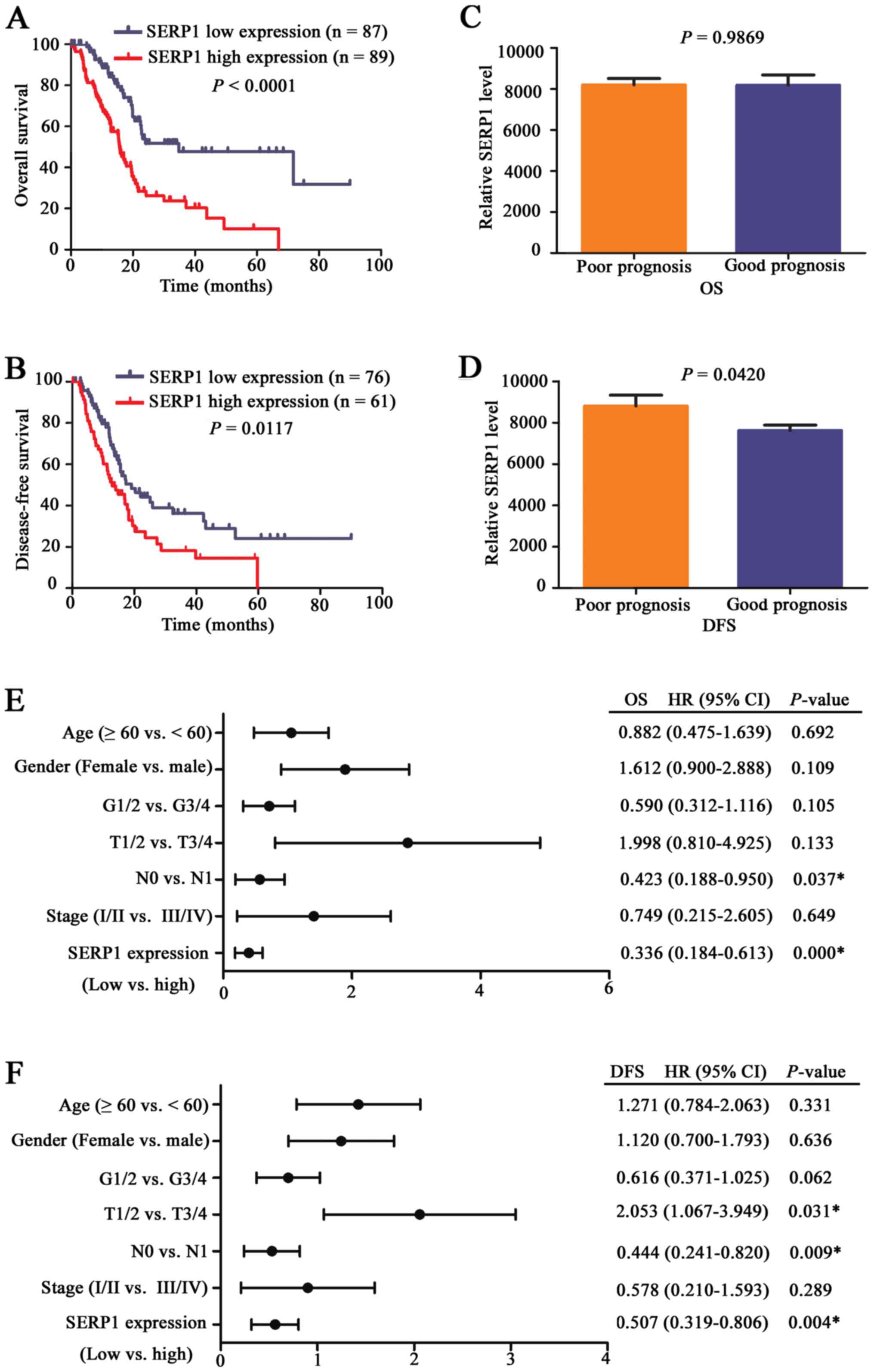 Next, patients were divided into SERP1 high expression and SERP1 low expression groups, prognostic role of SERP1 was further investigated. Kaplan-Meier curve showed that SERP1 high expression group had shorter OS and DFS compared with SERP1 low expression group in terms of survival duration (P<0.05) (Fig. 4A and B), particularly in OS. Next, patients were divided into good and poor survival groups, and results revealed that the expression level of SERP1 was higher in patients with shorter DFS (P=0.0420) (Fig. 4C and D). Moreover, multivariate Cox regression analysis further revealed SERP1 was an independent prognostic marker for PDAC patients (Fig. 4E and F).