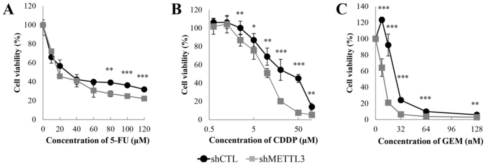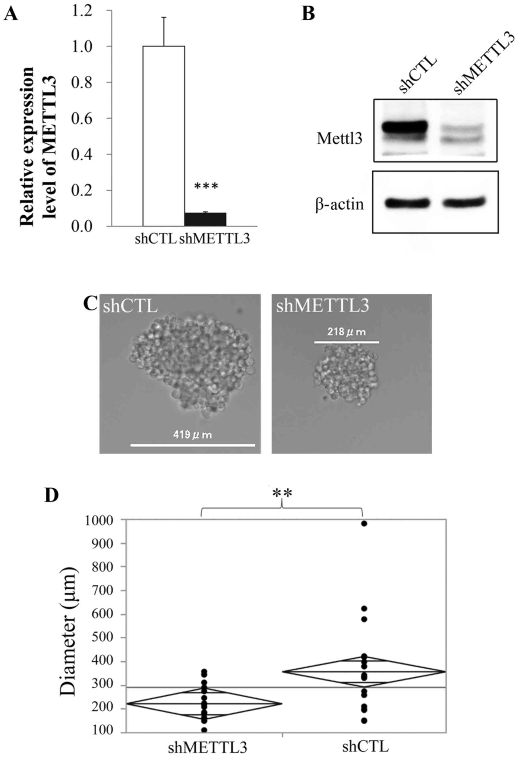 Total RNA was extracted from cultured cells using TRIzol reagent (Thermo Fisher Scientific) and cDNA was synthesized with ReverTra Ace (Toyobo Co., Ltd., Osaka, Japan). Quantitative RT-PCR was performed with Thunderbird SYBR qPCR Mix (Toyobo) using LightCycler 2.0 (Roche Molecular Systems, Inc., Pleasanton, CA, USA). Furthermore, data were analyzed by the ΔΔCt method, in which target genes were normalized to glyceraldehyde-3-phosphate dehydrogenase (GAPDH). The following primers were used in the present study: GAPDH-F, 5′-GCCCAATACGACCAAATCC-3′ and GAPDH-R, 5′-AGC CACATCGCTCAGACAC-3′; METLL3-F, 5′-CGTACTACA GGATGATGGCTTTC-3′ and METTL3-R, 5′-TTTCATCTA CCCGTTCATACCC-3′.