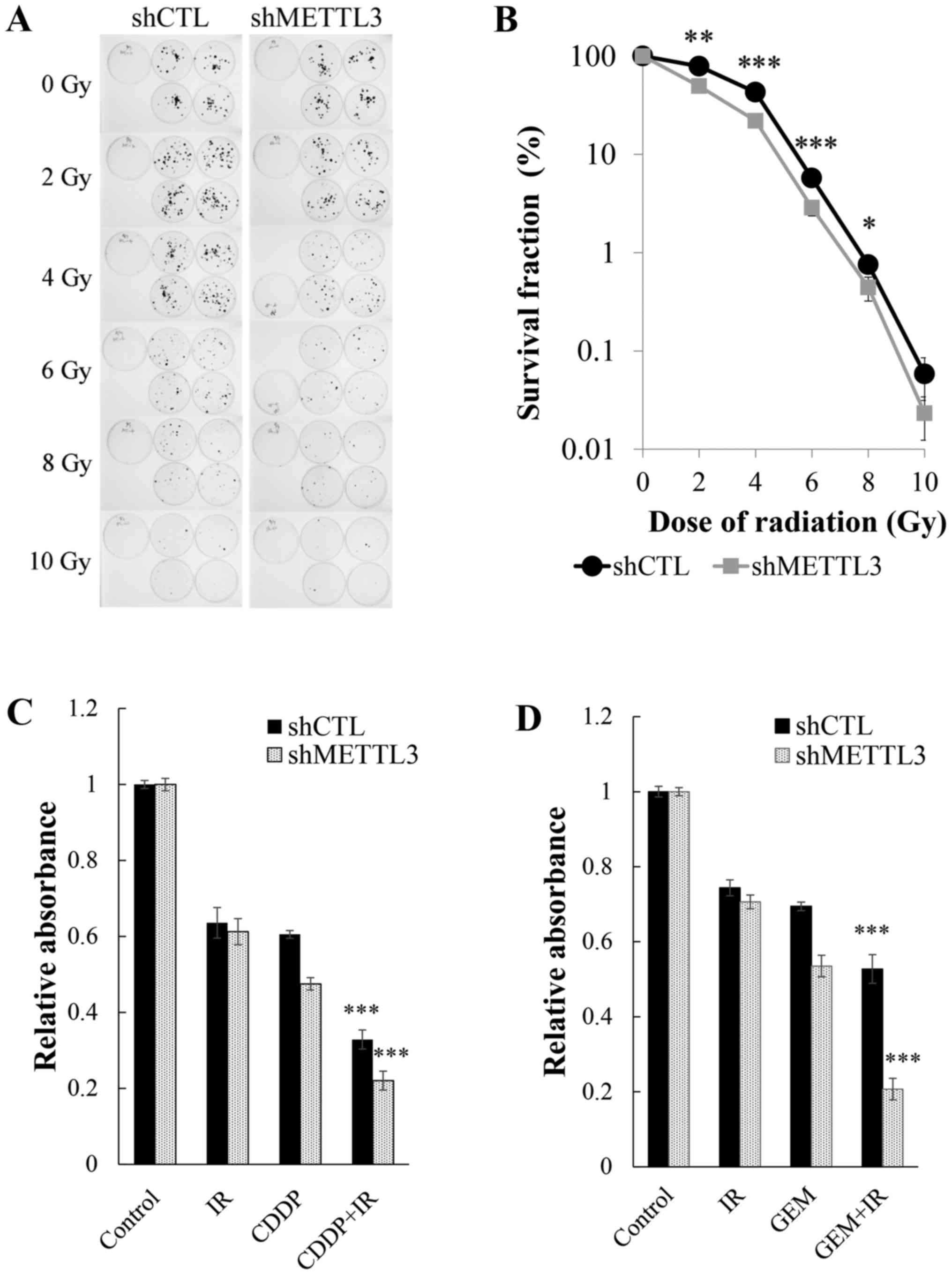 We performed crystal violet assay under administration of 5-FU, CDDP and GEM to test whether METTL3 KD alters sensitivity to anticancer agents. METTL3 depletion enhanced the sensitivity to each drug (Fig. 2). The IC50 values of 5-FU, CDDP and GEM were 28.0/18.4 µM (shCTL/shMETTL3), 33.3/10.3 µM and 25.9/10.6 nM, respectively. There was an obvious change in the drug sensitivity, especially in the presence of GEM. We also studied alterations of radiosensitivity derived from METTL3 KD. Clonogenic assay (Fig. 3A) revealed that METTL3 depletion resulted in enhancement of radiosensitivity with 2-8 Gy irradiation (Fig. 3B). Although no significant difference was observed with 10 Gy irradiation by statistical analysis, there was a strong tendency for shMETTL3 cells to be susceptible to irradiation, suggesting that METTL3 has important roles in the acquisition of resistance to anticancer drugs and irradiation. We next examined how toxic effects were enhanced in METTL3 KD cells when treated concurrently with drugs and irradiation at a dose of 4 Gy. The multifactor ANOVA showed a very significant effect of drug (GEM or CDDP) or radiation (P<0.0001) and significant synergistic effects of interaction (P≤0.001) in control and METTL3 KD cells (Fig. 3C and D).