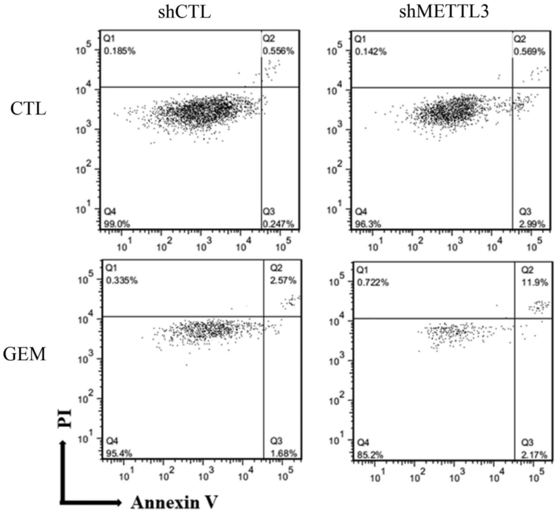 The aforementioned data suggested that METTL3 is involved in apoptosis; therefore, Annexin V assay was conducted 48 h after treatment with GEM (Fig. 4). Compared with control cells, the percentage of late apoptotic cells was increased from 2.6 to 12% in shMETTL3 cells treated with GEM. Conversely, the percentage of live cells was decreased from 95 to 85% in shMETTL3 cells treated with GEM, suggesting that any apoptosis-related proteins were influenced by METTL3 depletion. To confirm this, we screened 35 apoptosis-related proteins using a human apoptosis proteome profiler array. No significant alteration was confirmed between shCTL and shMETTL3 cells (data not shown), implying that unknown other METTL3 target genes could be regulating apoptosis and chemo-/radiosensitivities.