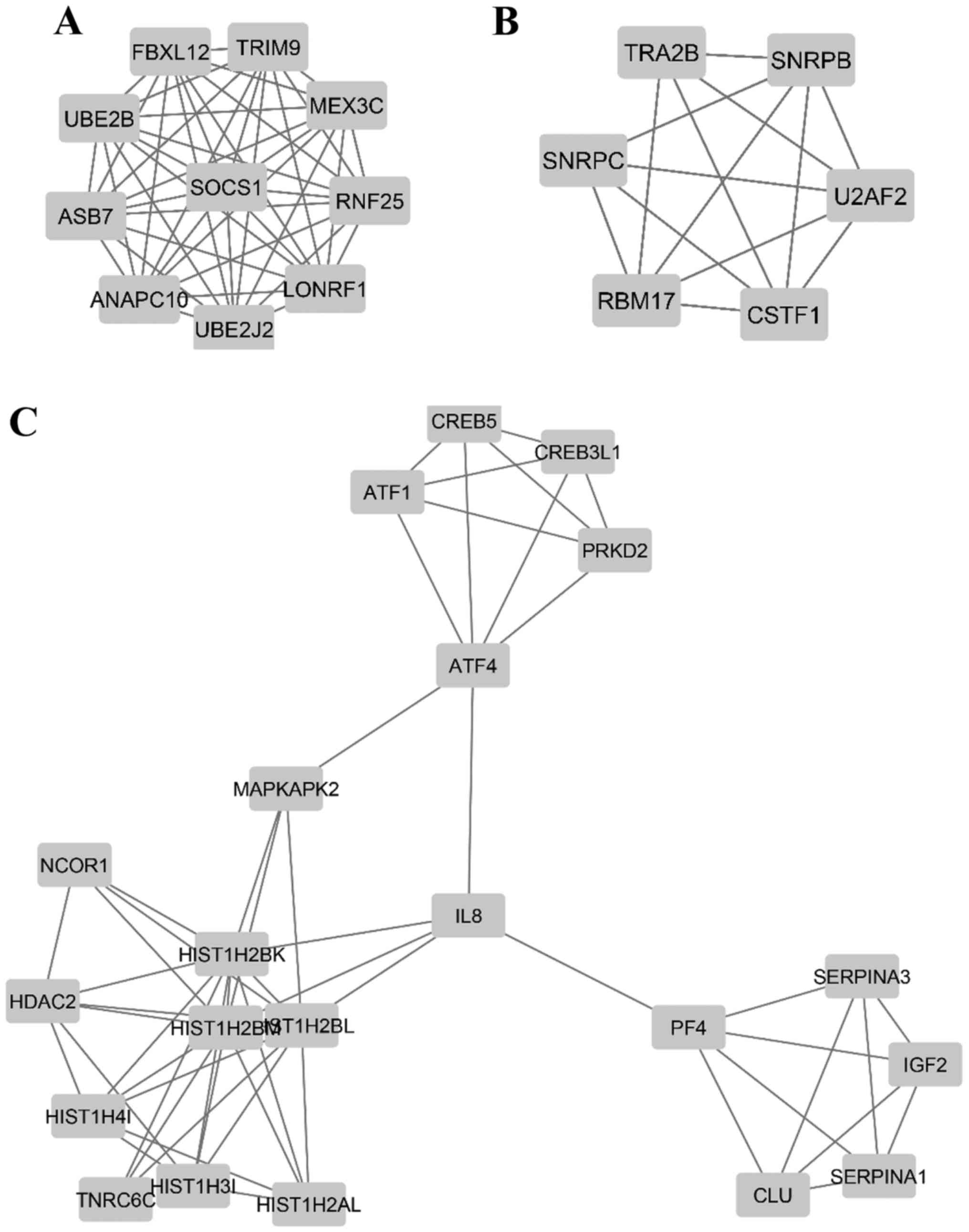 Given that METTL3 functions as m6A writers (12,13), we are interested in the global effect on networks of mRNA expression and protein-protein interaction (PPI). A total of 735 Ensembl ID-coded differentially expressed genes were identified, of which 104 were upregulated and 631 were downregulated. To clarify the functional and pathway enrichment of differentially expressed genes, GO analysis was applied using DAVID and the top 5 GO terms and Reactome pathways of upregulated and downregulated differentially expressed genes were selected according to P-value (Tables I and II). The upregulated genes were associated primarily with immune or interferon reactions, indicating effects by shRNA transfection. Conversely, the downregulated differentially expressed genes were associated mainly with regulation of mitogen-activated protein kinase (MAPK) cascades and cellular component organization. We next focused on PPI networks of downregulated differentially expressed genes in shMETTL3 cells. The PPI analysis by STRING provided 209 nodes (genes) and 362 edges (interactions) in the network (Fig. 5), and additional MCODE analysis identified 3 modules that were associated with a ubiquitin-dependent process (including UBE2B, SOCS1, MEX3C, TRIM9, RNF25, LONRF1 and UBE2J2), RNA splicing (including RBM17, U2AF2, SNRPC, SNRPB and CSTF1), and regulation of cellular process (including HDAC2, IGF2, MAPKAPK2 and CLU), respectively (Fig. 6 and Table III).