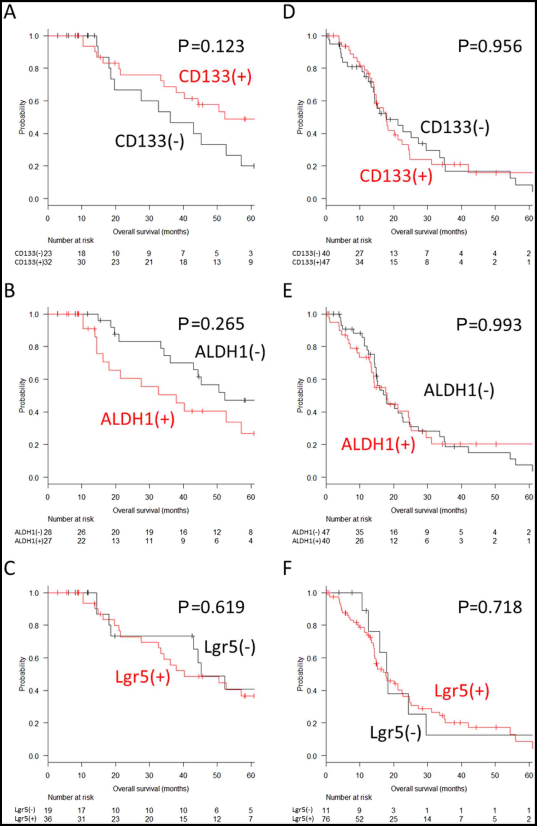 Another limitation is that the evaluation method of CD133 expression widely varies according to different reports, particularly in terms of the anti-CD133 antibody and the cut-off value (14,15). We believe that the immunohistochemical evaluation of CD133 is clinically practicable since the antibody is easily available and the analysis can be performed in many medical facilities. However, as variation in the evaluation method can cause inconsistent outcomes, standardised assessment criteria should be established. In addition, due to the small sample size of the study, the significance of ALDH1 and Lgr5 may be underestimated. Therefore, the findings of this study require confirmation in a larger patient cohort.