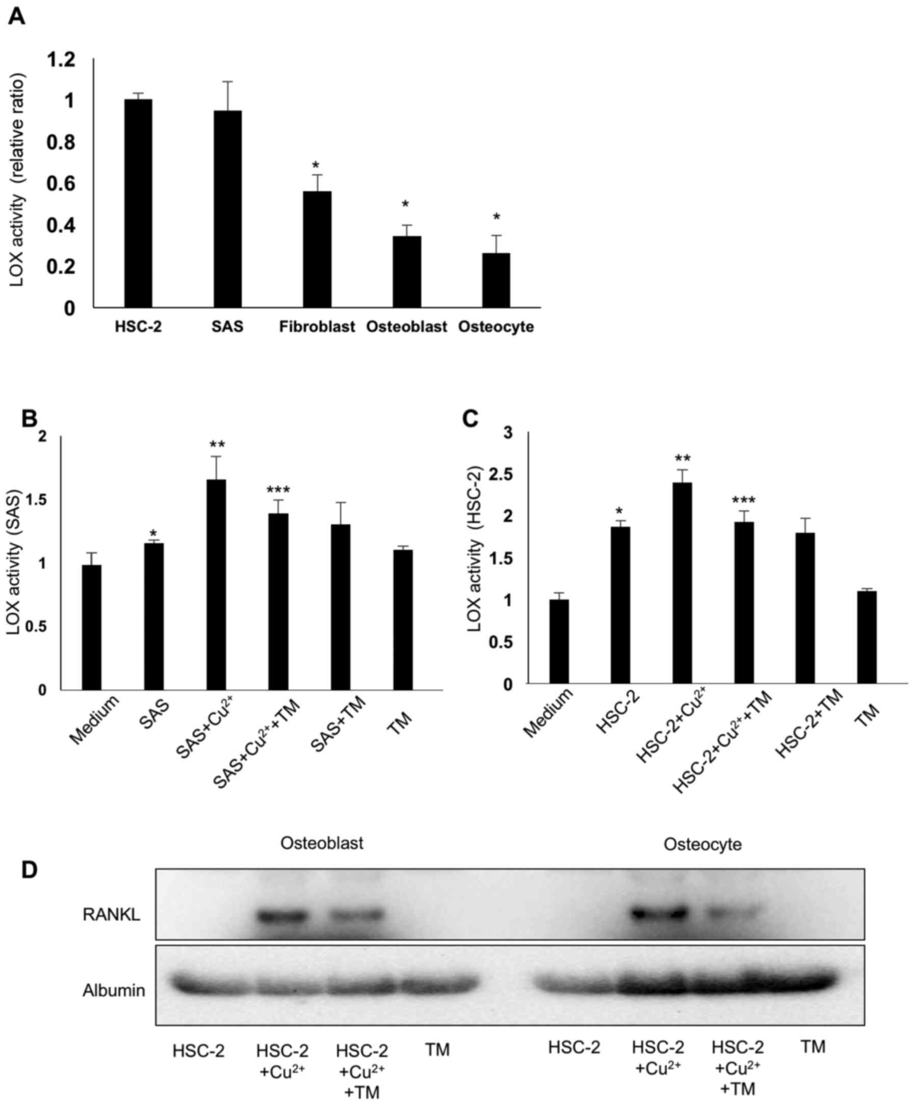 To examine the effects of copper-induced LOX activation on RANKL expression in bone marrow cells, we treated osteoblasts and osteocytes with HSC-2 conditioned medium and cultured the cells in increased copper ion concentrations with or without TM for 24 h. The HSC-2 conditioned medium and the presence of increased copper ions promoted RANKL expression in the osteoblasts and osteocytes. TM treatment decreased this effect via copper chelating (Fig. 4D).