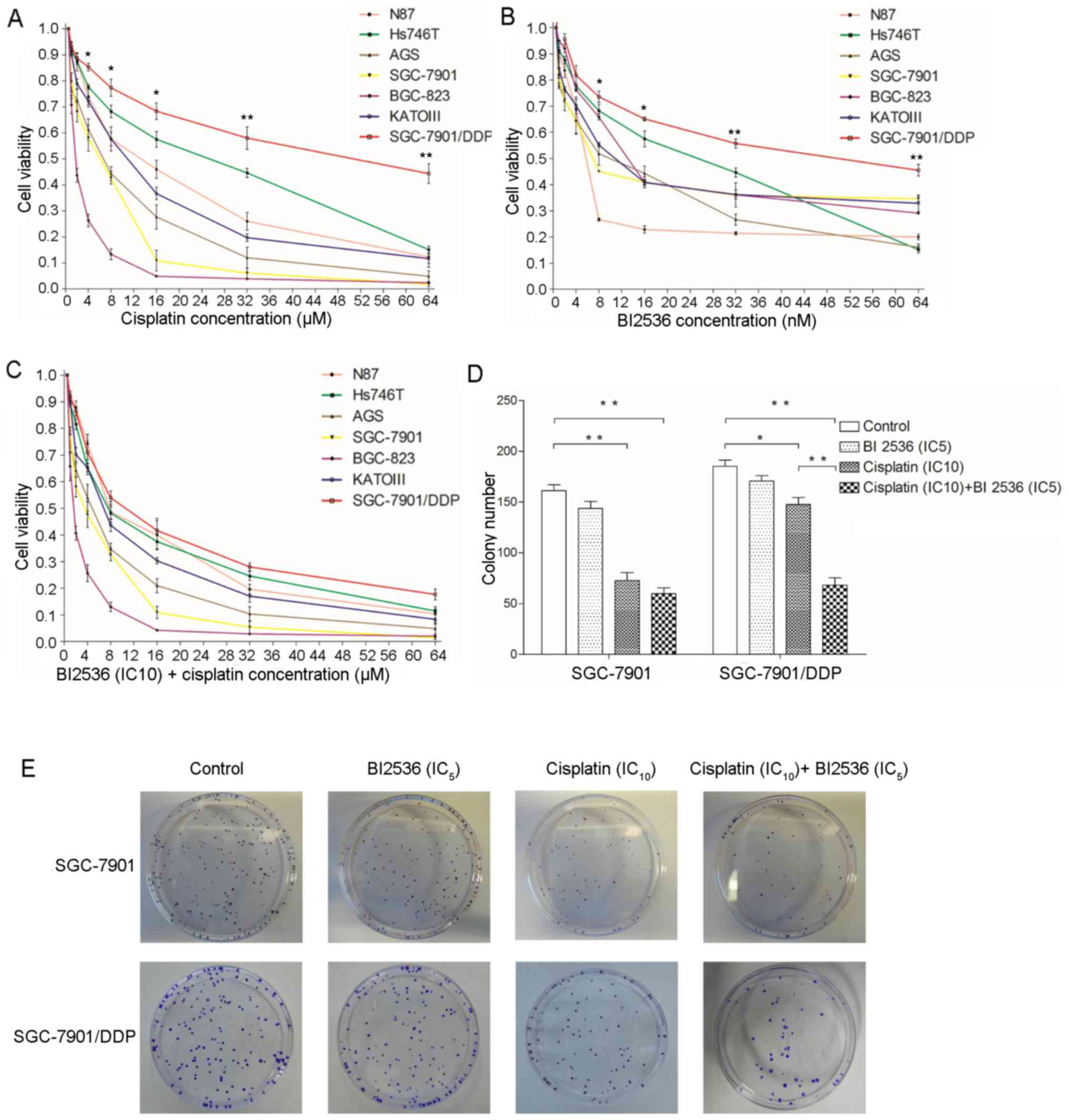 As shown in Fig. 2A and B, cisplatin and BI2536 significantly inhibited the viability of the 7 gastric cancer cell lines in a dose-dependent manner. The highest chemosensitivity to cisplatin was observed in the BGC-823 and SGC-7901 cells, the IC50 values of which were 2 and 6 µM, respectively. The least chemosensitivity to cisplatin was exhibited by the Hs746T and SGC-7901/DDP cells, the IC50 values of which were 30 and 60 µM, respectively. Notably, BI2536 (IC10) significantly enhanced the inhibitory effects of cisplatin on the viability of the gastric cancer cells, particularly by improving the chemosensitivity of SGC-7901/DDP to cisplatin (Fig. 2C). Therefore, a colony formation assay was then performed using the SGC-7901 and SGC-7901/DDP cells in order to verify the effects of BI2536 and cisplatin on cell viability. As shown in Fig. 2D and E, BI2536 (IC5) alone did not inhibit colony formation compared with the controls (P>0.05); however, cisplatin (IC10) significantly inhibited colony formation (P<0.05), particularly in the SGC-7901 cells (P<0.01). Following co-treatment with BI2536 (IC5) and cisplatin (IC10), the results revealed that BI2536 (IC5) significantly enhanced the inhibitory effects of cisplatin on the colony-forming ability of the SGC-7901/DDP cells (P<0.01), but not that of the SGC-7901 cells (P>0.05).
