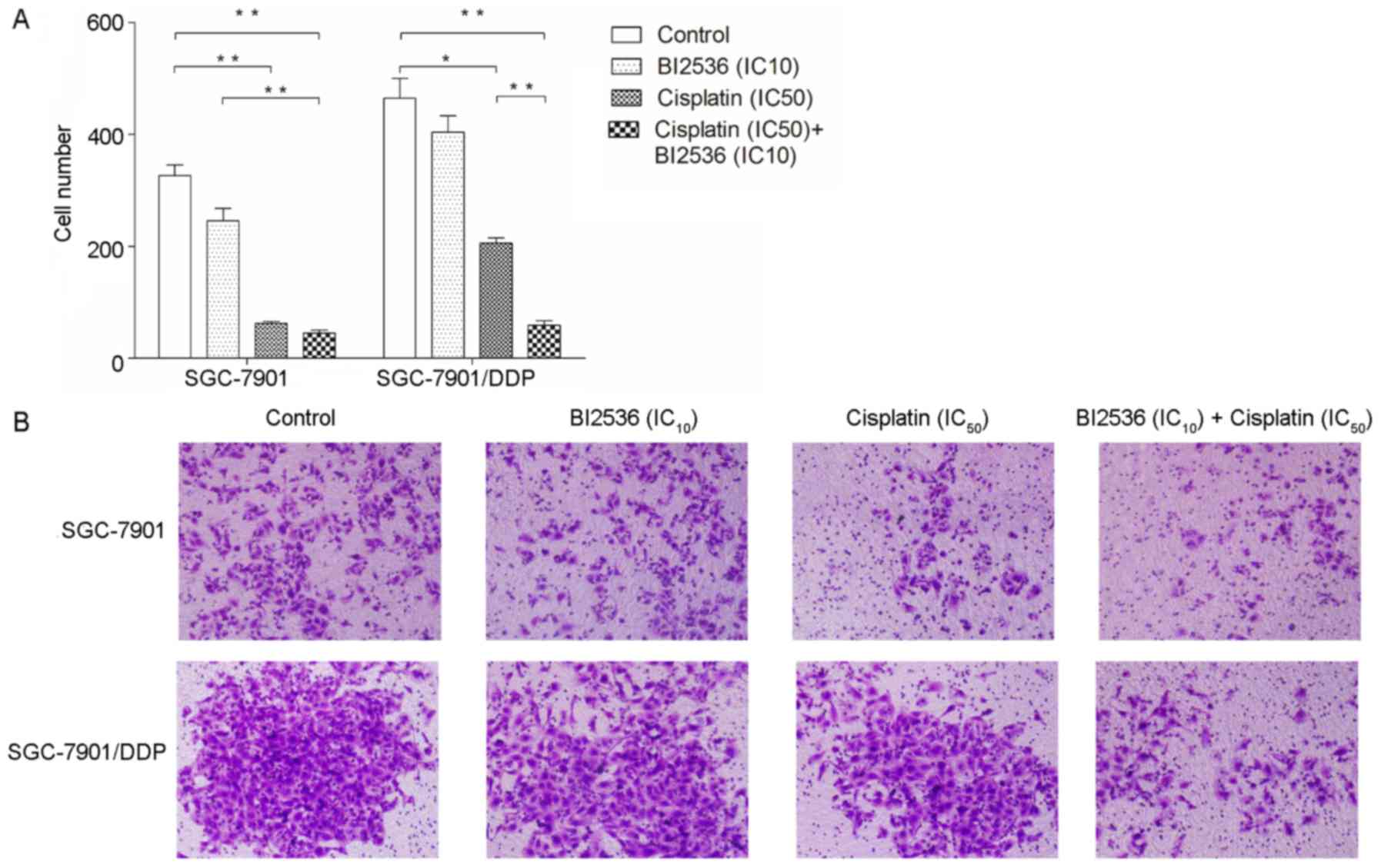 Cell invasion was evaluated using Transwell chambers (8-µm pore size; Corning Inc., Corning, NY, USA) coated with serum-free RPMI-1640 medium containing Matrigel (Sigma-Aldrich, Shanghai, China). In brief, the SGC-7901 and SGC-7901/DDP cells (5×104 cells) were grown in the upper chamber containing medium with 10% FBS, and BI2536 (IC10) and cisplatin (IC50) were then added to treat the cells. The lower chamber was filled with RPMI-1640 medium containing 20% FBS as a chemoattractant. Following incubation for 24 h at 37°C, the non-invading cells were removed using cotton swabs, and the invading cells were stained with 1% crystal violet for 30 min. The invading cells in different fields were then counted using a light microscope (Nikon Model Eclipse TS100LED MV; Nikon Corp., Tokyo, Japan).
