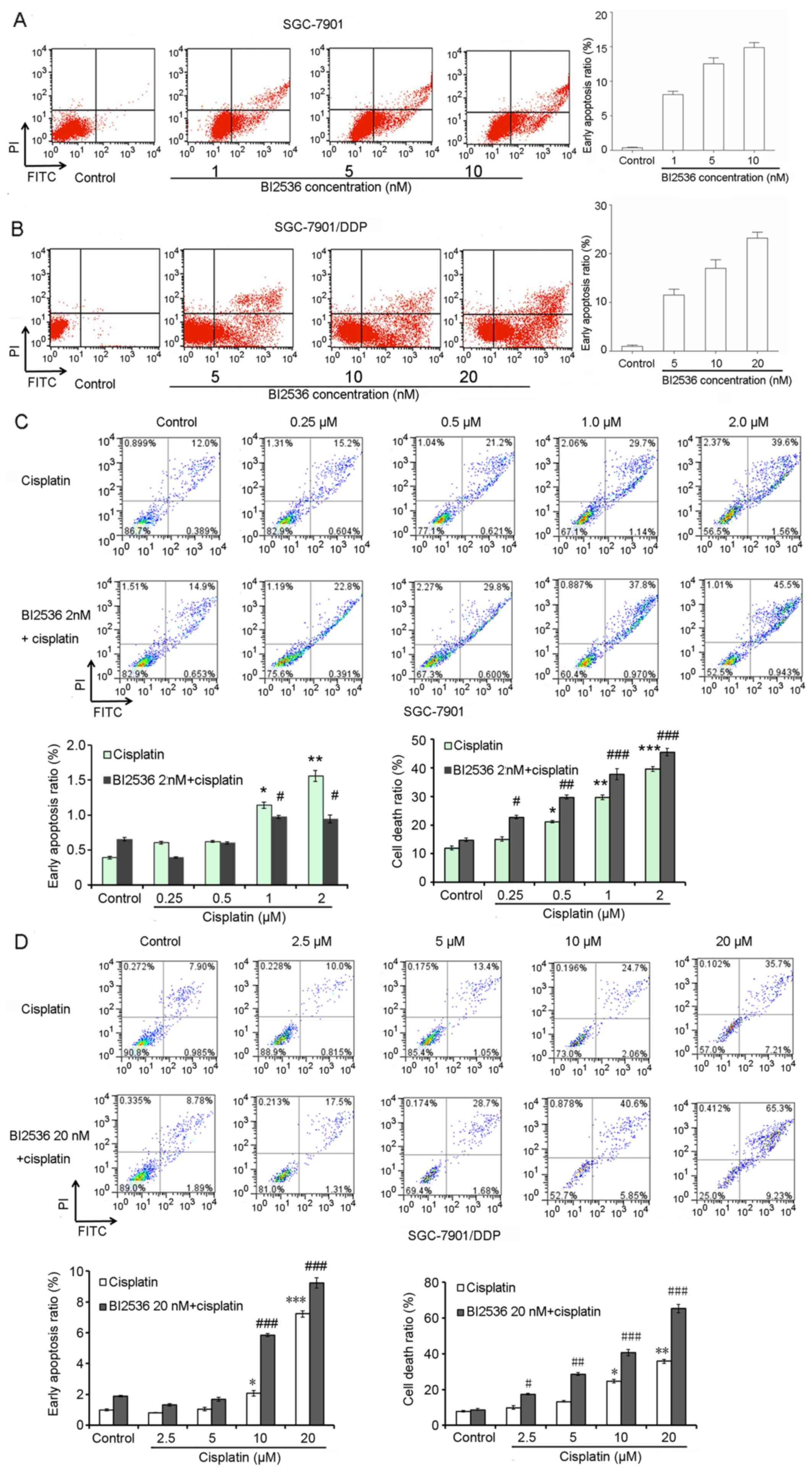 Flow cytometry was also performed to determine the effects of BI2536 on gastric cancer cell apoptosis. Following treatment with various concentrations of BI2536 for 24 h, the proportions of SGC-7901 and SGC-7901/DDP cells undergoing early apoptosis were all significantly increased (P<0.05) (Fig. 5A and B). Furthermore, we found that cisplatin significantly induced SGC-7901 and SGC-7901/DDP cell apoptosis when used in combination with BI2536 (IC20) (P<0.05) (Fig. 5C and D). Notably, BI2536 (IC20, 20 nM) significantly promoted cisplatin-induced SGC-7901/DDP cell apoptosis (P<0.05) (Fig. 5D).