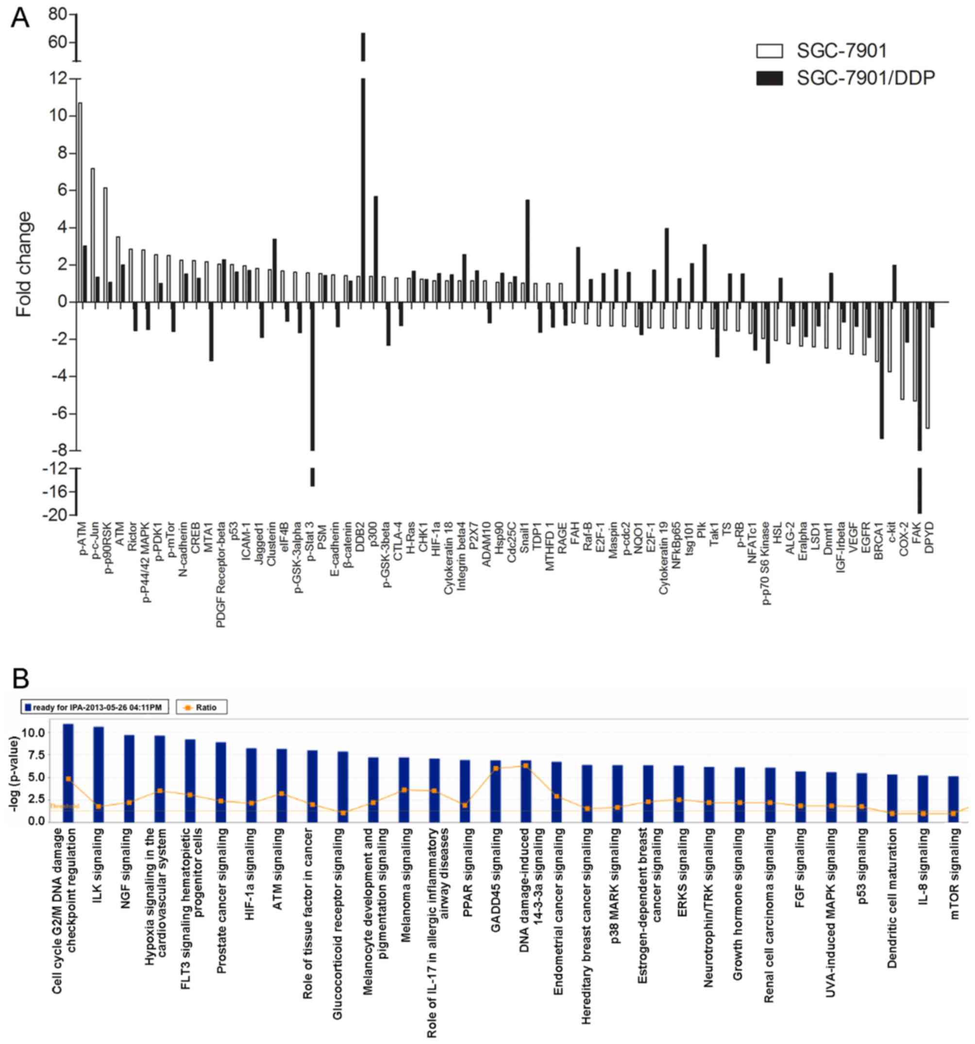 We applied PPA analysis to analyze the differentially expressed proteins between the SGC-7901 and SGC-7901/DDP cells following treatment with BI2536 (IC50) for 48 h. We found that 68 proteins were differentially expressed when compared with the controls (Fig. 6A). IPA analysis also revealed that the differentially expressed proteins induced by BI2536 treatment were involved in many cell functions and signaling pathways, such as cell death, cell development, tumorigenesis, the cell cycle, DNA duplication/recombination/repair, cellular movement, and in the Wnt/β-catenin and mitogen-activated protein kinase (MEK)/extracellular signal-regulated kinase (ERK)/ribosomal S6 kinase 1 (RSK1) signaling pathways (Fig. 6B).