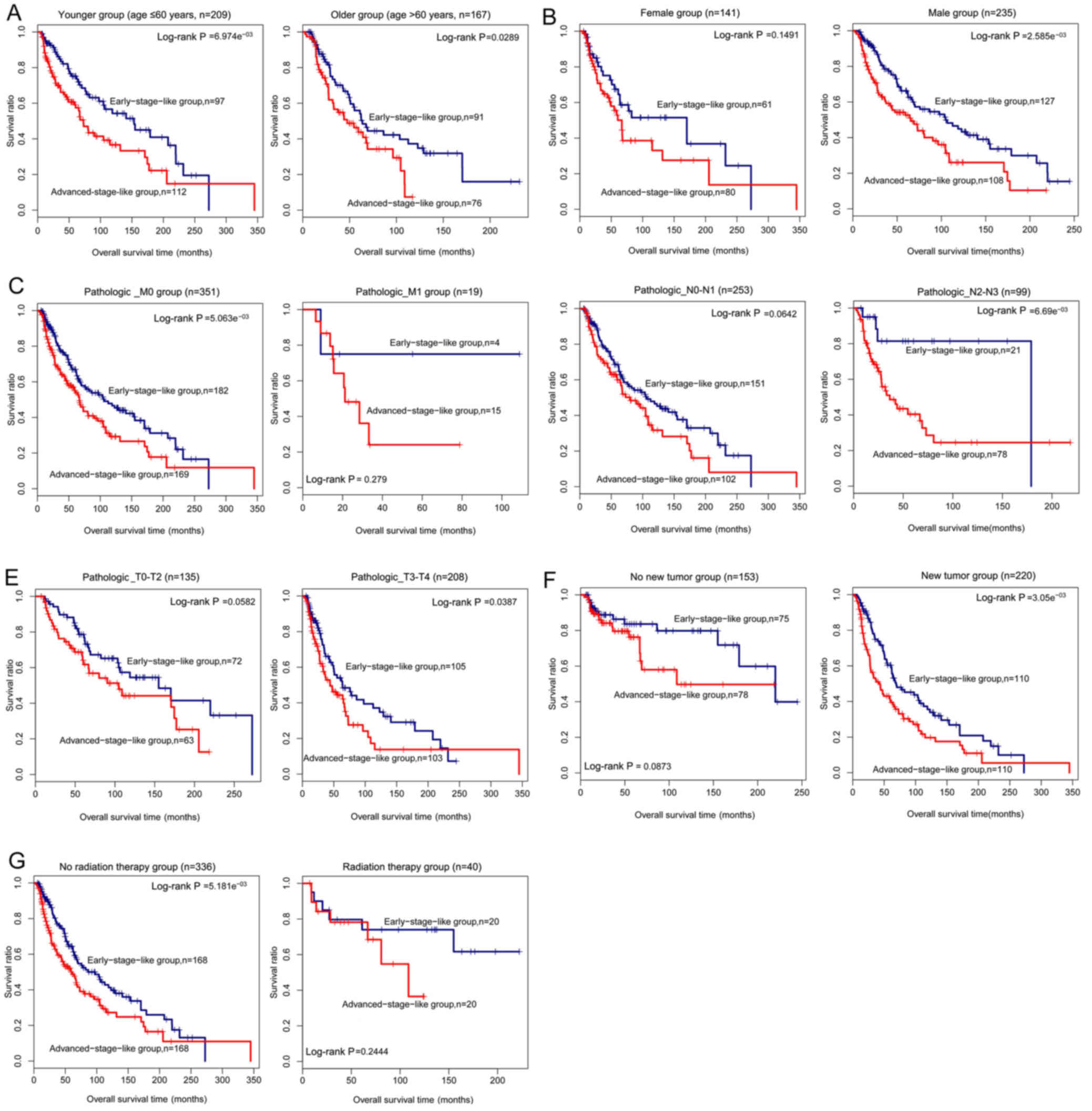 Furthermore, the samples were stratified by clinical characteristics and classified using the six-lncRNA signature-based SVM classifier. As shown in Table IV, the SVM classifier was also effective in distinguishing the early-stage samples from the advanced-stage samples for patients of any age, male patients, patients with pathologic_M0 or pathologic_N2-N3 or pathologic_T3-T4, patients with new tumors, and patients who did not receive radiation therapy (P-value <0.05) (Fig. 9). It should be noted that some information for several samples was not available in the dataset.