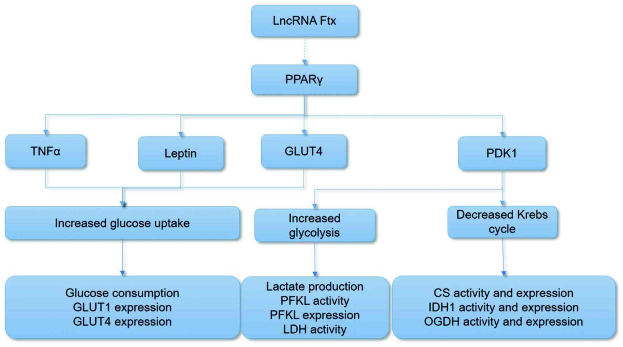 Taken together, the present results provide the first evidence, to the best of our knowledge, that lncRNA Ftx promotes aerobic glycolysis and HCC cell progression by activating the PPARγ pathway. However, certain questions remain unclear and require further study. First, PPARγ may be proposed as the downstream effector of lncRNA Ftx, although direct binding was not proven in the present study and requires investigation. In addition, the alternative targets of lncRNA Ftx upon enhancing glycolysis merit investigation, in addition to in vivo experiments.