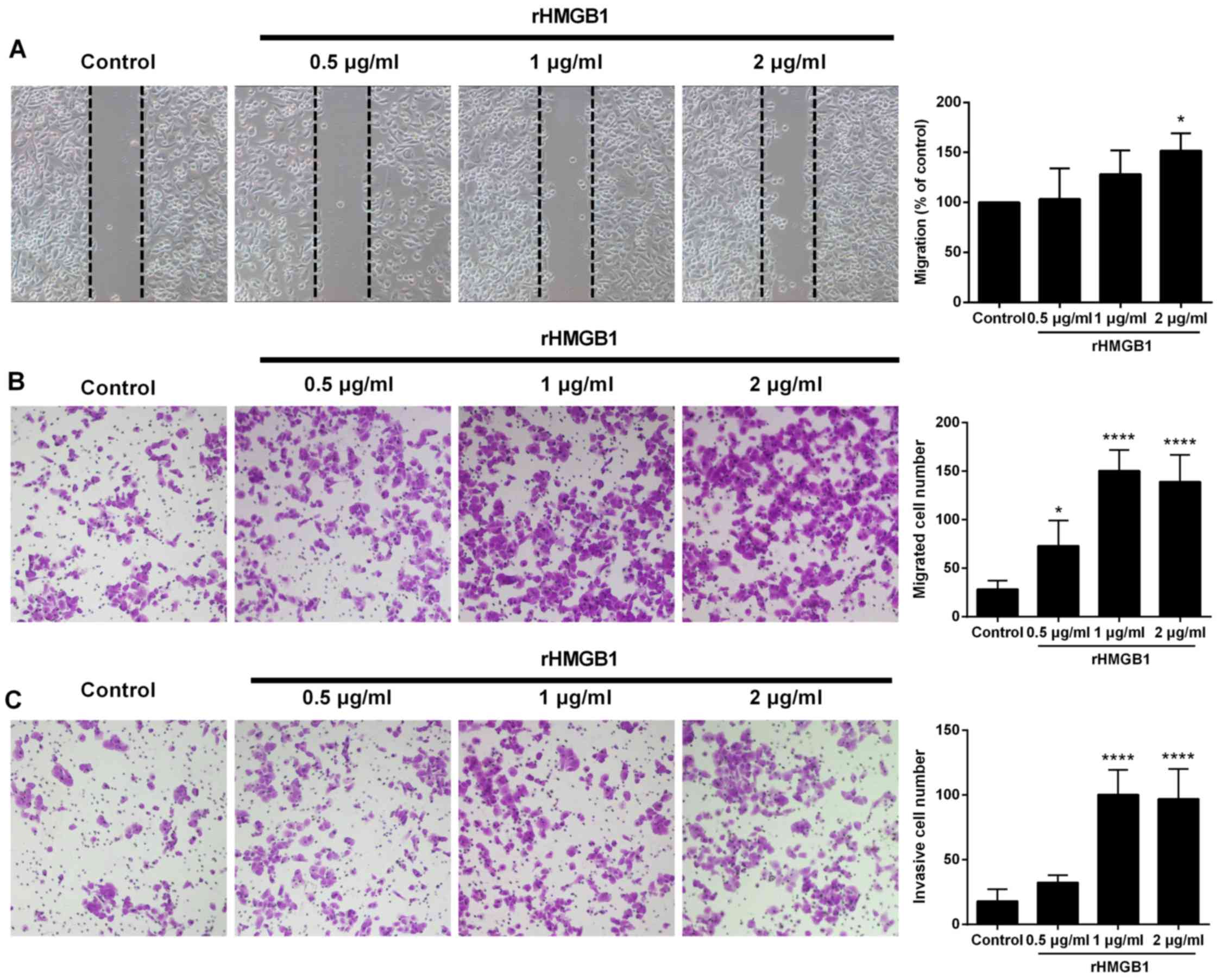 Cell migration and invasion assays were performed using Transwell chambers (pore size, 8 µm; Costar; Corning Incorporated, Corning, NY, USA), whereby the base was coated with 1 mg/ml BD Matrigel matrix (BD Biosciences, Franklin Lakes, NJ, USA) for the invasion assay. Cells were diluted at a cell density of 2×105 cells/ml. A total of 200 µl DMEM containing rHMGB1 was added to the upper chamber and 600 µl DMEM was added to the lower chambers. After 24 h of culture, the cells that invaded into the lower chamber were fixed with 4% formalin for 15 min at room temperature. The cells on the inner layer were then gently removed with a cotton swab and the adherent cells on the lower surface of the insert was stained with 0.1% crystal violet for 30 min at room temperature. The filters were washed with water several times and images were captured (original magnification, ×100). Invaded cells on the lower surface were counted under a light microscope (Nikon Corporation).