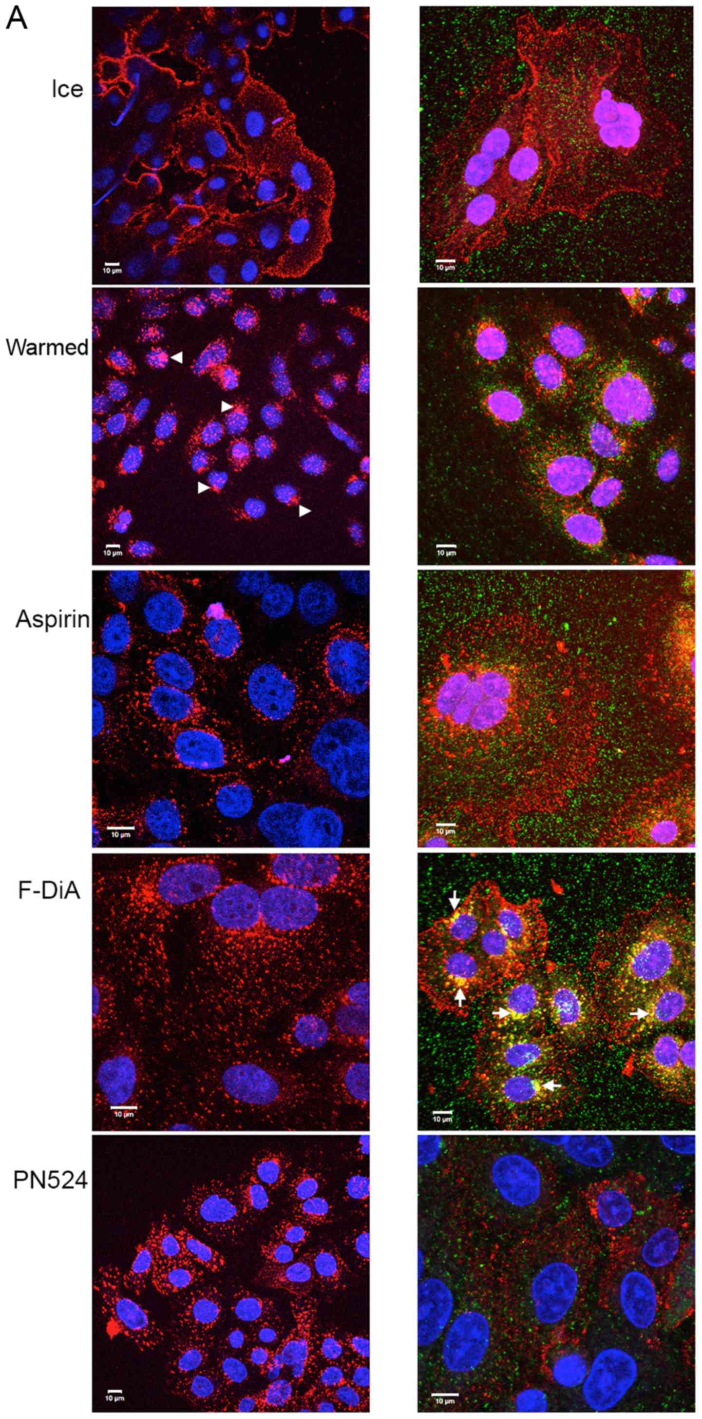 EEA1 is a Rab5 effector, intimately involved in tethering, docking and fusion of early endosomes (79) and mediating crosstalk between signalling pathways (80). It was therefore examined whether spatial and temporal regulation of the internalisation of EGF was perturbed by examining the colocalisation of Alexa Fluor 555-labelled EGF (100 ng/ml) and EEA1 following a chase in the absence and presence of aspirin and aspirin analogues. This was performed while additionally controlling pH alterations with HEPES (10 mM at pH 8; Fig. 3) or phosphate buffers (data not shown) to minimise acidification caused by the addition of the aspirin derivatives. Buffering did not appear to attenuate the effects exhibited by aspirin and aspirin analogues. Peripheral EGF staining, interpreted as membrane-localised, was apparent without a chase, whereas EGF internalisation to a perinuclear location occurred in the absence of compounds upon warming to 37°C in the vehicle control group (Fig. 3). In the presence of compound at 0.5 mM, a concentration used to reduce any non-specific effects caused by acidification, and under buffered conditions, aspirin or aspirin analogues rapidly perturbed EGF internalisation (Fig. 3A). Colocalisation of EEA1 and EGF was consistently enhanced, as evidenced by dual staining, when cells were incubated with F-DiA, suggesting that the pathway of internalisation of EGF in the presence of F-DiA is substantially altered in comparison to aspirin and PN524, a brominated salicylate exhibiting an intermediate toxicity between aspirin and F-DiA (27) to SW480 cells. Furthermore, endosomal EEA1 staining was enhanced, when cells were incubated with F-DiA, based on the intensity of the fluorescence in the perinuclear location.