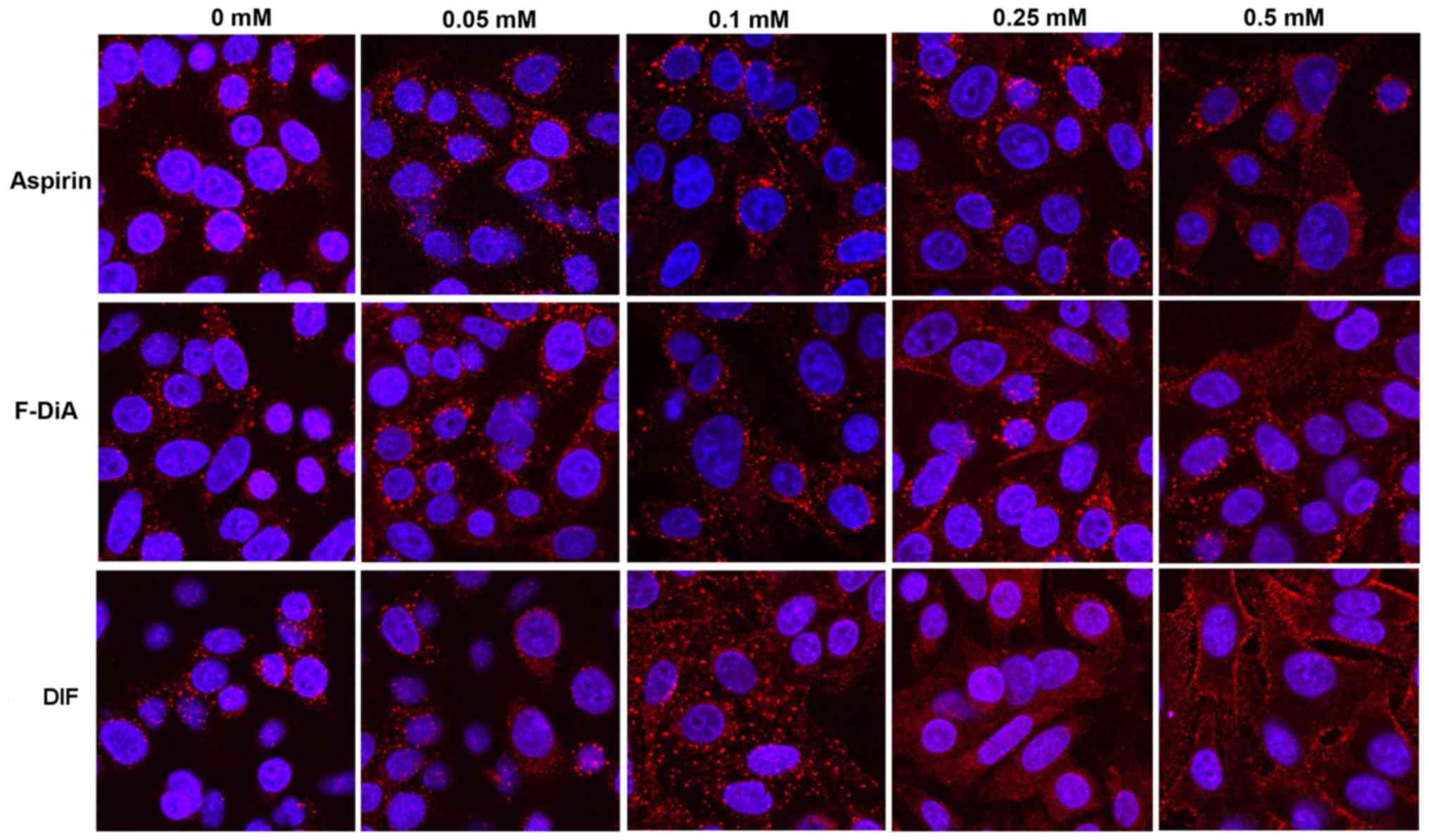 For EGFR clustering, SW480 cells were cultured on glass coverslips in 6-well tissue culture plates to 70% confluence and serum-starved for 48 h. For experiments testing compounds, cells were pre-incubated at 37°C for 30 min in the absence or presence of the drug, followed by 15 min at 4°C prior to the addition of equivalent volume of cold (4°C) serum-free culture medium containing 250 ng/ml (stock) recombinant (r)EGF (cat. no. E9644; Sigma-Aldrich; Merck KGaA, Darmstadt, Germany) to achieve a final concentration of 125 ng/ml rEGF. The cells were then incubated for 60 min at 4°C to allow EGF binding. The cells were warmed to 37°C over 25 min to stimulate EGF clustering and EGFR internalisation, washed with PBS, fixed for 5 min with acetone/methanol (-20°C; 1:1, v/v) and incubated with blocking buffer for 60 min at room temperature. The cells were then incubated with anti-EGFR (D38B1) XP® rabbit antibodies (Alexa Fluor 488-conjugate; 1:100) for 60 min in blocking buffer at 37°C, washed with PBST (0.02%) and the coverslips were placed onto a drop of Prolong Gold antifade reagent with DAPI mounting medium (cat no. P36935; Invitrogen; Thermo Fisher Scientific, Inc.) prior to fluorescence microscopy (×400). Aspirin, DiA, F-DiA and PN529 were added at a final concentration of 0.5 or 1 mM to independent wells in 6-well plates. The controls without aspirin analogue were fixed following EGF binding for 60 min (no EGF internalisation) or following warming of the cells for 25 min at 37°C (with EGF internalisation).