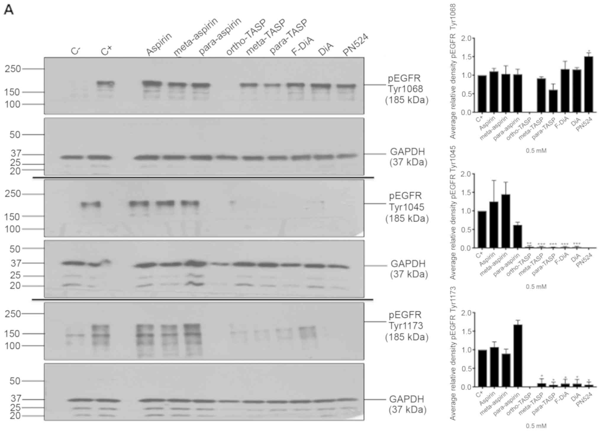 Non-specific inhibition of kinase activity has been proposed as a mechanism of action for aspirin and sodium salicylate (59). Hence, compound effects on EGFR phosphorylation, focusing on cytoplasmic phosphotyrosine residues in the ligand-induced autophosphorylation domain were examined, including Tyr1045, Tyr1068 and Tyr1173. Phosphorylated Tyr1045 acts a site for c-Cbl interaction that results in receptor ubiquitylation and degradation of EGFR, and Cbl regulates receptor downregulation and signalling (83). Phosphorylation of Tyr1068 enhances binding of the growth factor receptor bound protein 2 (Grb2), which is necessary for entry into coated pits (41) and Ras/MAPK activation (84,85). Phospho-Tyr1173 is involved in binding the tyrosine phosphatase SHP1 and signalling via recruitment of the adaptor proteins SHC and Grb2, resulting in control of the ERK activity (86-88). In the present study, SW480 cells were incubated overnight with the compounds of interest and briefly stimulated with 200 ng/ml rEGF (5 min) in serum-free medium. EGFR phosphorylation status was analysed by immunoblotting (Fig. 7A). The data suggested that inhibition of EGFR phosphorylation upon stimulation, by aspirin (ortho and meta) was weak. Tyr1045 and Tyr1173 phosphorylation was more sensitive to the presence of diaspirins, including F-DiA (PN517) and PN524, and thioaspirins, including ortho-TASP, meta-TASP and para-TASP, compared with Tyr1068. Thioaspirin (ortho-TASP) was the sole compound able to inhibit phosphorylation at all sites tested herein. These findings suggested that aspirin and analogues at the concentration tested (0.5 mM), even when cells are stimulated with high rEGF concentrations (200 ng/ml), did not universally inhibit all autophosphorylation sites, which argues against aspirin or its analogues acting solely as a non-specific kinase inhibitor, as suggested by Frantz et al (59). Due to the sensitivity of Tyr1045 to the compounds and its role in receptor degradation, the compound effects on EGF phosphorylation at this site with a 2-h incubation period were further examined and modest changes were observed by immunoblot analysis (Fig. 7B). As aspirin was reported to normalise EGFR expression (89), the effect of aspirin and its analogues on total EGFR levels in SW480 cells was further investigated following a 24-h incubation (Fig. 7C). SW480 EGFR levels were substantively affected by diflunisal, but weaker changes were observed as a result of incubation with F-DiA (PN517), PN524 and PN529, with little evidence of a significant reduction in EGFR by aspirin or salicylate following a 24-h incubation. pEGFR levels relative to total EGFR at pY1068 and pY1173 sites was totally inhibited by ortho-TASP and significantly reduced at pY1045 and pY1173 phosphorylation sites by meta-TASP, para-TASP, F-DiA, DiA and PN524. The pEGFR level at pY1068, pY1045 and pY1173 was increased by aspirin, meta-aspirin and para-aspirin (Fig. 7D).