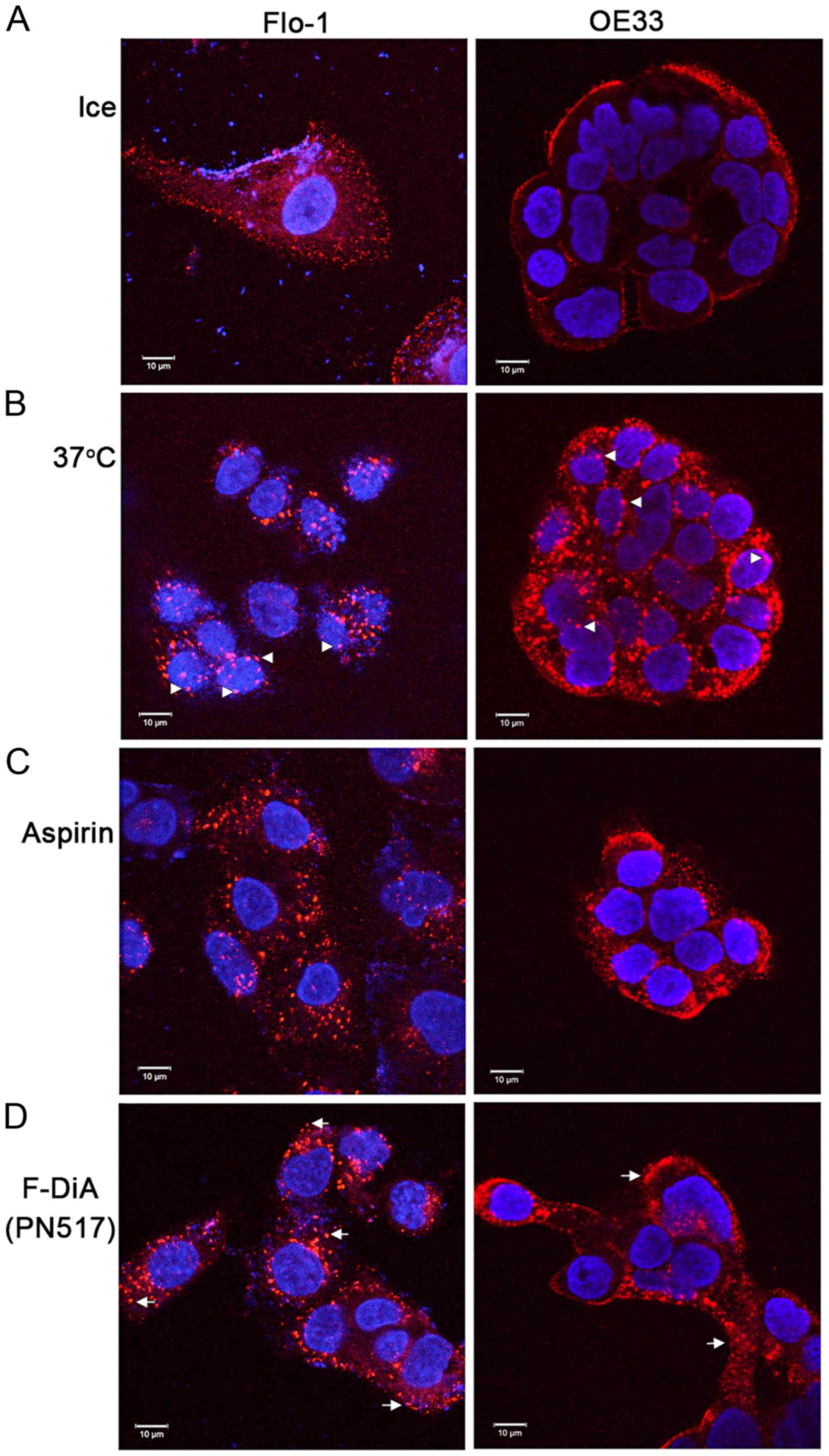 It was further explored whether the phenomenon reported herein was restricted to SW480 cells. To that end and due to evidence that aspirin is chemopreventive in oesophageal cancer (92,93), Alexa Fluor 555-EGF internalisation was examined in the presence of the stated compounds with HEPES buffering in Flo-1 and OE33 oesophageal cancer cells. It was observed that aspirin and F-DiA perturbed EGF internalisation (at 20 ng/ml) in the oesophageal cancer cell lines (Fig. 8). EGF internalisation was markedly affected by F-DiA (PN517) in the Flo-1 cells, whereas a modest effect was observed with aspirin.