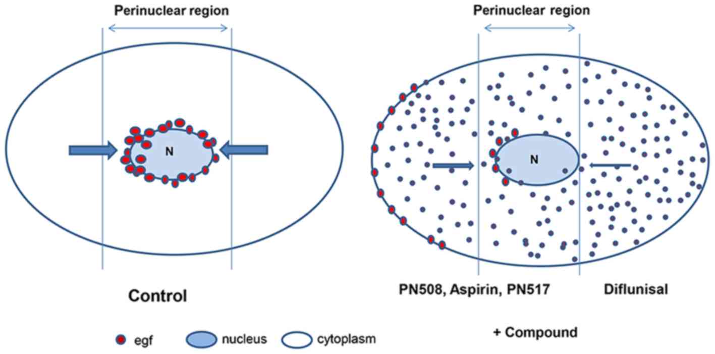 Given the fundamental role of EGF signalling in cancer biology, the findings reported in the present study have relevance to the understanding of the chemopreventive activity of aspirin, particularly with respect to COX-independent pharmacology. A schematic illustration of the effect of selected compounds on EGF internalisation is presented in Fig. 9, based upon the representation of the endosomal system by Taub et al (55). It is suggested that further research is required to evaluate the rapid effect of salicylates on the EGFR axis, with a focus on MAPK activation and EGF/EGFR trafficking and phosphorylation. Furthermore, experimentation on EGF signalling in normal tissues exposed to aspirin or diflunisal is required to establish the physiological relevance of the observations reported herein. An analysis of the response of other growth factors and their cognate ligands to physiological concentrations of salicylates, with a particular emphasis on growth factor trafficking and recycling, appears timely. From a biochemical perspective, salicylate is a lipophilic monohydroxybenzoic acid that can interact with lipid membranes (104,105). It is also conceivable that interference of salicylates with membrane structure may affect endocytosis (106).