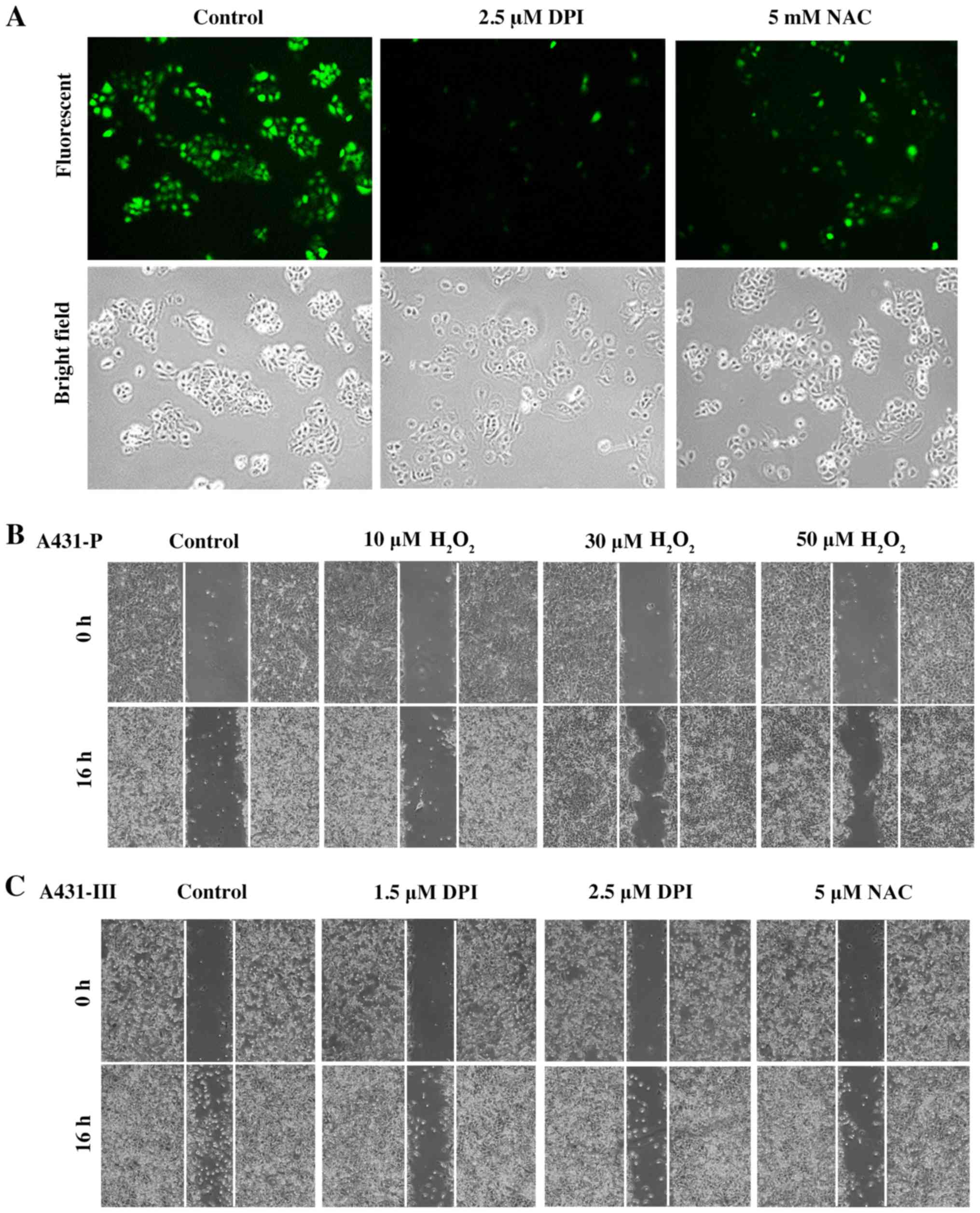 The A431-P (1×106 cells/well) and A431-III cells (1×106 cells/well) were seeded into 6-well plates and incubated overnight. Manual scratching using a pipette tip and subsequent washing with PBS was performed to create the wound in the cell monolayers. The A431-P cells were treated with 10, 30 and 50 µM of H2O2, and the A431-III cells were treated with 1.5, 2.5 and 5 µM of N-acetyl-1-cysteine (NAC; Sigma-Aldrich; Merck KGaA) at 37°C for 16-h. Additionally, A431-P and A431-III cells transfected with MnSOD siRNA was pre-treated with 20 µM of diphenyleneiodonnium (DPI; Sigma-Aldrich; Merck KGaA) at 37°C for 3-h and then cultured for an additional 17 h at 37°C were also analyzed. Images of the monolayers were captured following wounding using phase-contrast microscopy and an Olympus IX70 camera (Olympus Corporation, Tokyo, Japan) to determine the size of the wound.