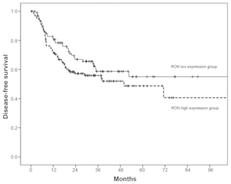 Tissue processing and immunohisto-chemical analysis were performed as previously described (22). Tissue sections were incubated with primary antibodies against RON (cat. no. sc-25781; Santa Cruz Biotechnology). Two independent observers interpreted RON staining with no knowledge of the associated clinical information. Staining intensity was scored as follows: 0, no staining of tumor cells; 1+, weak-to-comparable staining in the cytoplasm and/or nucleus, compared to non-tumor cell staining; 2+, readily appreciable or dark brown staining distinctly marking the tumor cell cytoplasm and/or nucleus. Percentages of stained cells were scored as follows: 0, 0%; 1, 1-25%; 2, 26-50%; 3, 51-75%; and 4, >75%. Final staining scores were the product of the intensity and percentage scores, with ≤4 defined as low RON expression and >4 defined as high RON expression.