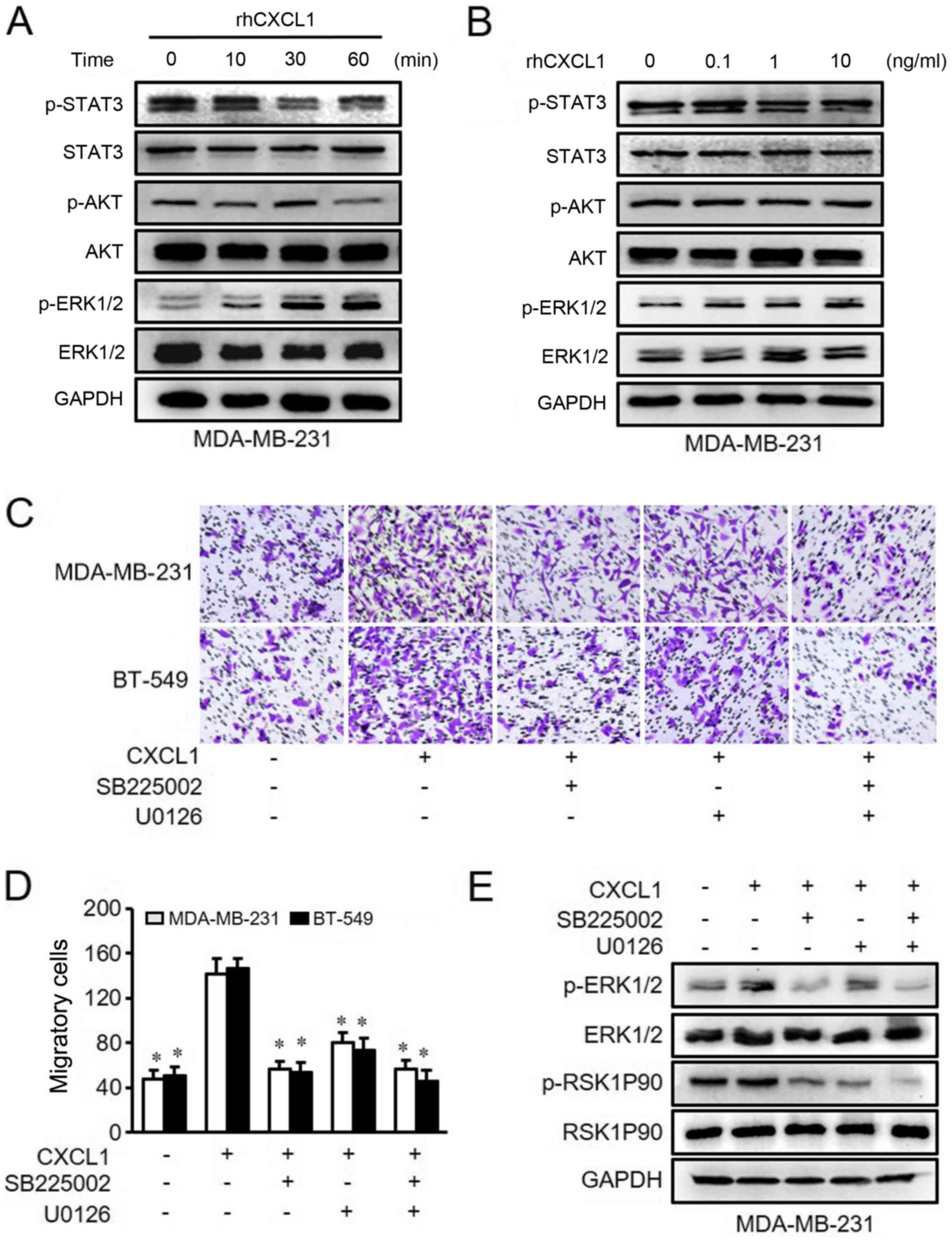 The ER-negative BC cell lines BT-549, MDA-MB-231 MDA-MB-468, and HS578t, and the ER-positive BC cell lines T47D, MCF-7 and ZR-75-1 were purchased from the American Type Culture Collection and maintained in RPMI-1640 medium (Gibco; Thermo Fisher Scientific, Inc.) or Dulbecco's modified Eagle's medium/F12 with 10% fetal bovine serum (both from Gibco; Thermo Fisher Scientific, Inc.), 100 µg/ml streptomycin and 100 U/ml penicillin (Invitrogen; Thermo Fisher Scientific, Inc.) at 37°C in a 5% CO2 standard humidified incubator. For time- and dose-dependence experiments, MDA-MB-231 and BT-549 BC cells were treated with recombinant human (rh)CXCL1 at concentrations of 0, 0.1, 1 or 10 ng/ml for 1 h at 37°C, and treated with 1 ng/ml rhCXCL1 for 0, 10, 30, 60 min at 37°C in a 5% CO2 standard humidified incubator. MDA-MB-231 and BT-549 BC cells were treated the combinations of treatments (1 ng/ml rhCXCL1 + 200 nM SB225002, 1 ng/ml rhCXCL1 + 5 µM U0126, 1 ng/ml rhCXCL1 + 200 nM SB225002 + 5 µM U0126) at 37°C in a 5% CO2 standard humidified incubator. rhCXCL1 (cat. no. 275-GR) was obtained from R&D Systems, Inc. The CXCR2 inhibitor SB225002 (cat. no. S7651) and the MEK1/2 inhibitor U0126 (cat. no. S1102) were purchased from Selleck Chemicals.