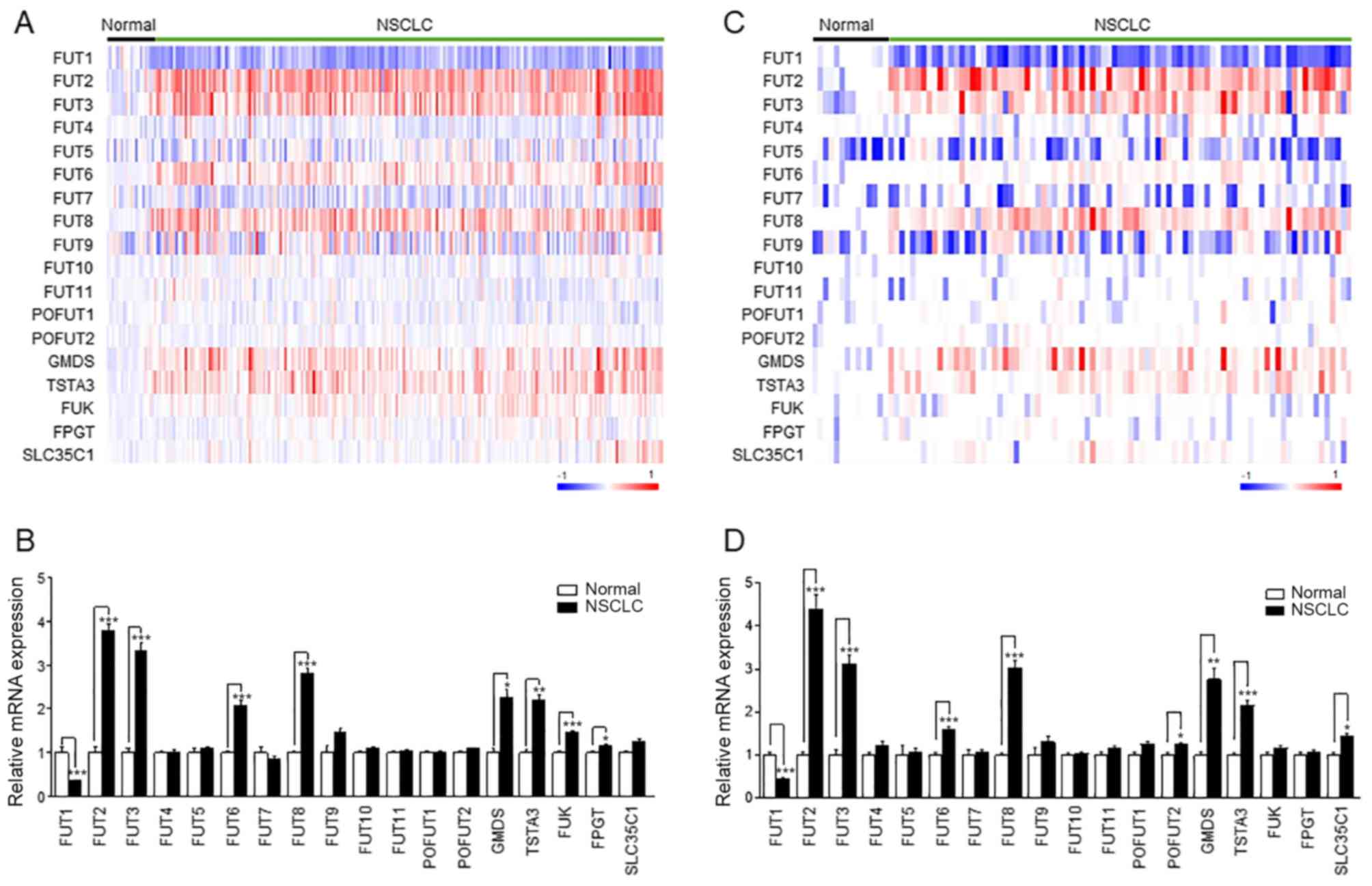 The present study aimed to analyze microarray data obtained from NSCLC samples. The findings of this study may help characterize the oncogenic role of fucosylation in NSCLC biology and highlight its potential for therapeutic targeting.