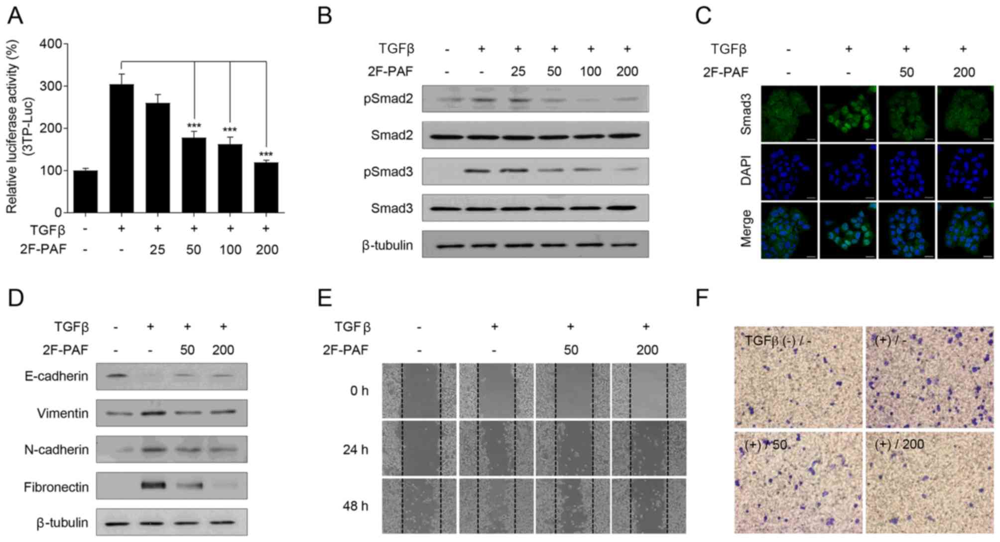 NCI-H3122 cells (2x104) were seeded on glass coverslips in 12-well plates. At 24 h, cells were treated with the conditions indicated in figure legends (1 ng/ml TGFβ and 50-200 µM 2F-PAF). Cells were fixed with 4% formaldehyde in PBS for 5 min, permeabilized with 0.3% Triton X-100 for 7 min, and blocked with 3% normal goat serum in PBS for 1 h at room temperature. Subsequently, cells were probed with an anti-Smad3 antibody (1:200; cat. no. 9523; Cell signaling Technology, Inc.) overnight at 4˚C and stained with FITC-conjugated anti-rabbit IgG antibody (1:1,000; cat. no. A21441; Invitrogen; Thermo Fisher Scientific, Inc.) and DAPI (Roche Diagnostics GmbH). The stained cells were imaged with a FluoView 1000 confocal microscope (x40 magnification; Olympus Corporation).