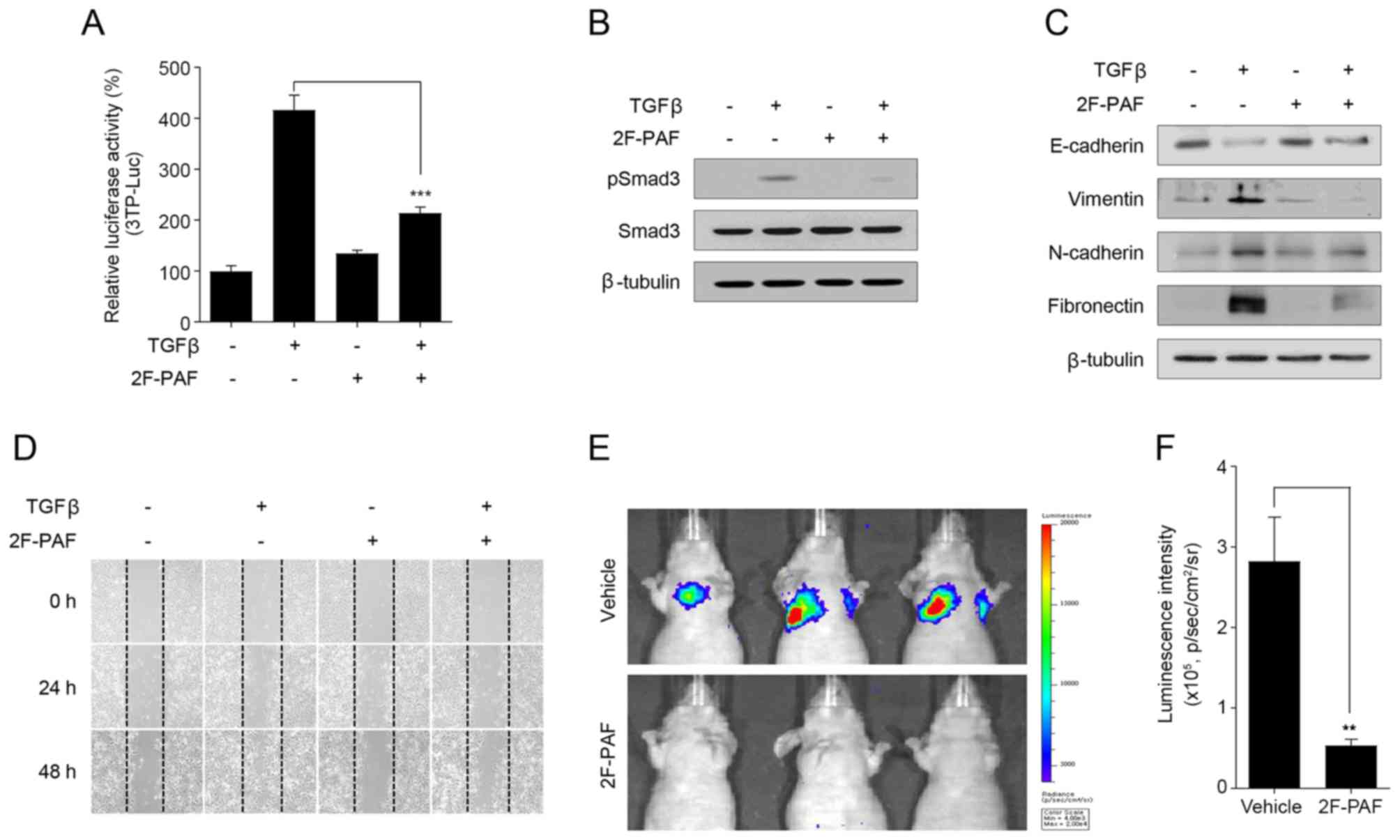 In addition to in vitro experiments, further experiments were performed to examine whether 2F-PAF may attenuate tumor metastasis in vivo. The anti-metastatic activity of 2F-PAF was examined using highly metastatic Calu-1 NSCLC cells. 2F-PAF inhibited TGFβ signaling in Calu-1 cells (Fig. 3A and B) without exhibiting any cytotoxicity effects 27683099 (Fig. S9B). The expression levels of EMT marker proteins in Calu-1 cells were also analyzed. Similar to NCI-H3122 cells (Fig. 2D), TGFβ decreased the expression level of E-cadherin and increased those of vimentin, N-cadherin, and fibronectin, and these effects were reversed by 2F-PAF (Fig. 3C). In addition, wound-healing assay demonstrated that 2F-PAF decreased TGFβ-induced Calu-1 cell migration (Fig. 3D and Fig. S10D-F), which was similar to the results observed in NCI-H3122 cells (Fig. 2E).