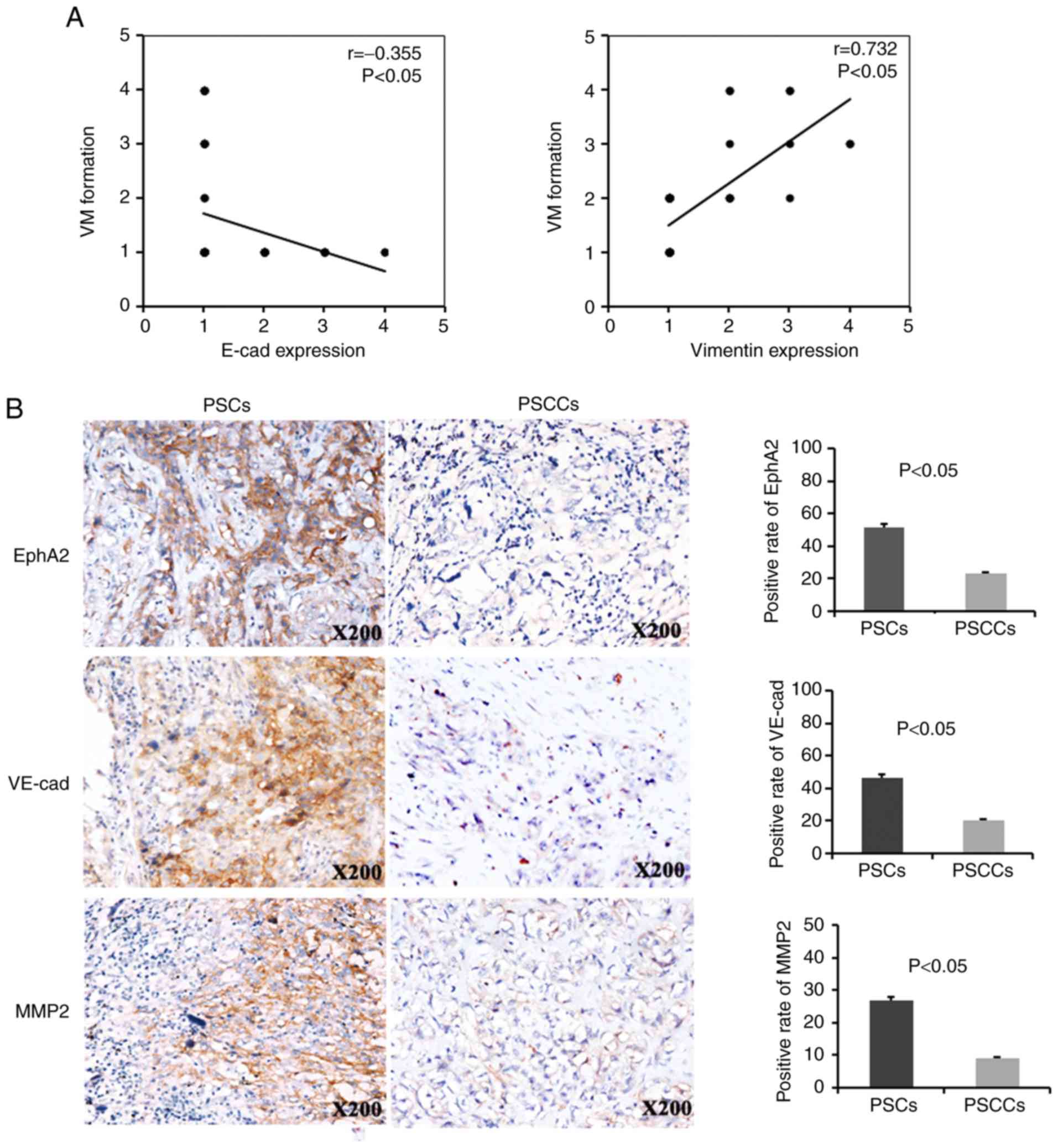In the PSCs, VM formation exhibited a negative correlation with E-cadherin expression and a positive correlation with Vimentin expression (r=−0.355, P<0.05; r=0.732, P<0.05, respectively) (Fig. 2A). Of the 41 PSCs analysed, 21 (21/41, 51.2%), 19 (19/41, 46.3%) and 11 (11/41, 26.8%) were positive for EphA2, VE-cadherin and MMP2, respectively. Of the 79 PSCCs analysed, 18 (18/79, 22.8%), 16 (16/79, 20.3%) and 7 (7/79, 8.9%) were positive for EphA2, VE-cadherin and MMP2, respectively. Therefore, the expression of the VM markers, EphA2, VE-cadherin and MMP2, was higher in the PSCs compared with the PSCCs (Fig. 2B).