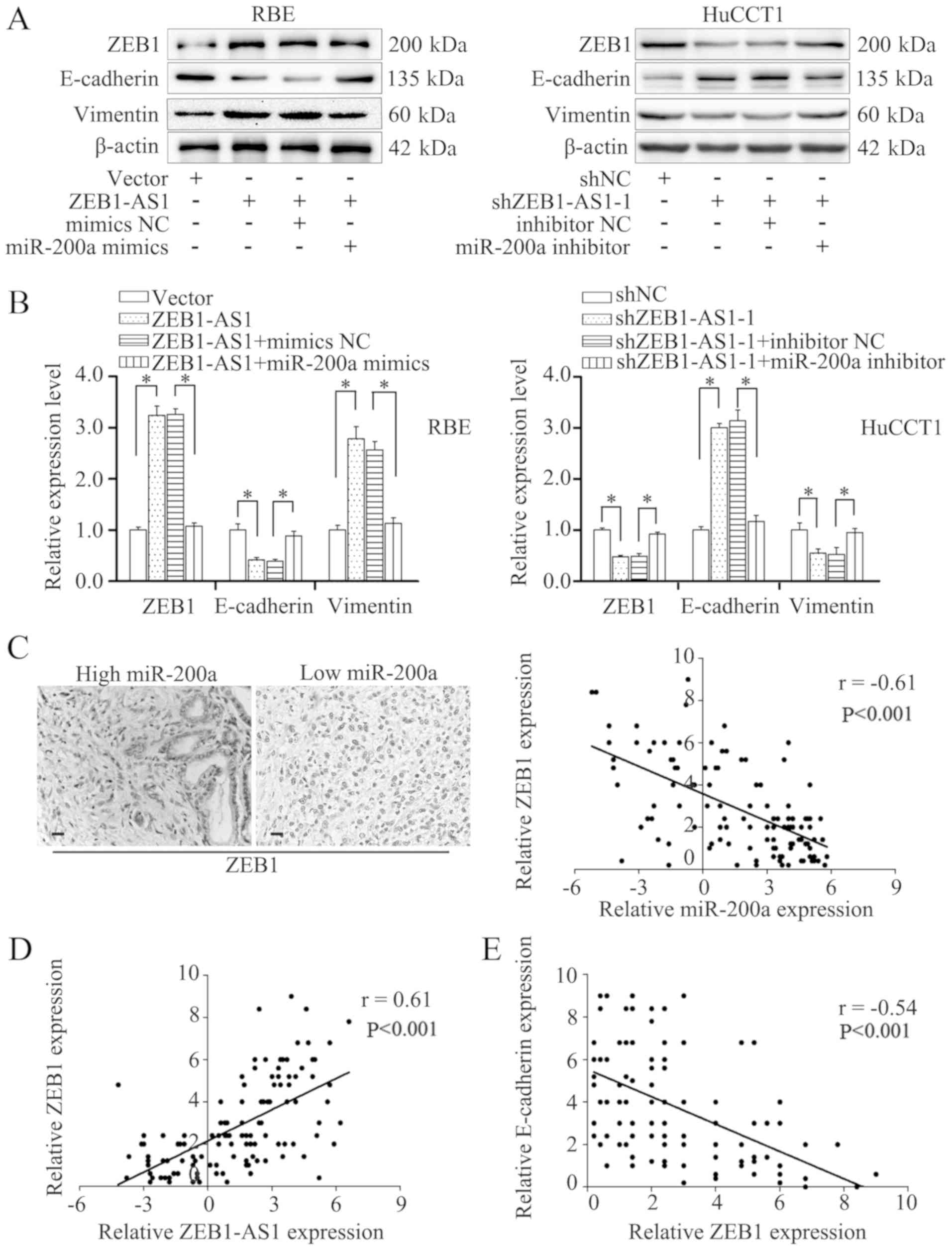 ZEB1, a master regulator of EMT (26), is a potential target of miR-200a (33,34). Previous studies have reported that ZEB1-AS1 can function through ZEB1 (32,35,36). Thus, the present study evaluated the expression of ZEB1 by IHC; the results revealed indicated a negative association between miR-200a and ZEB1 (Fig. 7C, left panels). In addition, Spearman's correlation analysis also revealed a negative correlation between ZEB1 and miR-200a expression (Fig. 7C, right panel). Transfection with miR-200a mimics reversed the upregulated expression of ZEB1 induced by ZEB1-AS1 overexpression, and transfection with miR-200a inhibitor restored the reduced expression of ZEB1 induced by ZEB1-AS1 silencing (Fig. 7A and B). Moreover, the expression of ZEB1 positively correlated with that of ZEB1-AS1, but negatively correlated with E-cadherin expression in the IHCC tissues (Fig. 7D and E). These findings demonstrate that ZEB1-AS1 induces EMT through the miR-200a/ZEB1 signaling pathway.