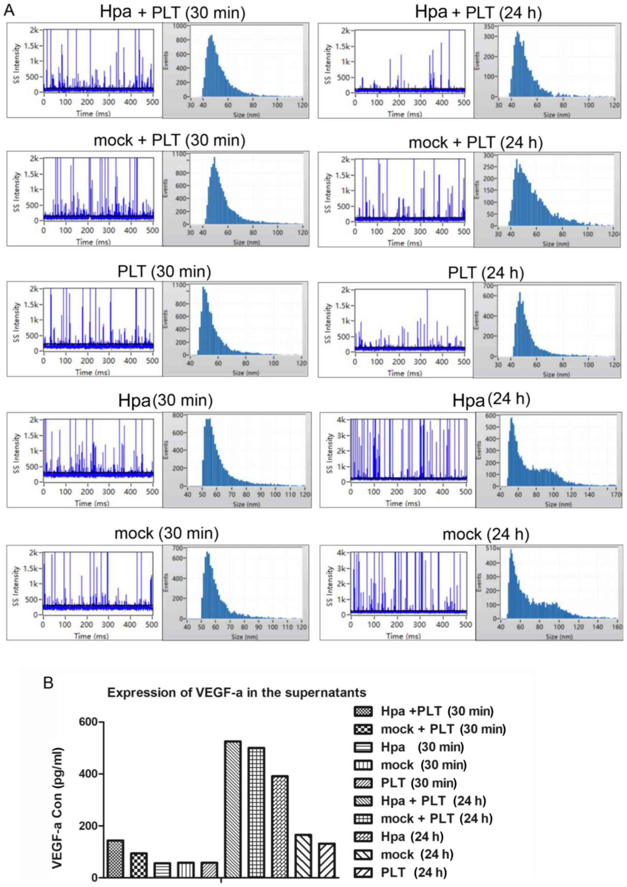 The physical characteristics of the supernatants (Fig. 4A; Table I) were as follows: i) Within a certain period of time (30 min-24 h), prolonging the culture time promoted release of bioactive substances: Hpa + PLT (24 h) >Hpa + PLT (30 min); mock + PLT (24 h) >mock + PLT (30 min); Hpa (24 h) >Hpa (30 min); mock (24 h) >mock (30 min); PLT (24 h) >PLT (30 min). ii) Coculture promoted release of bioactive substances: Hpa + PLT (30 min) >Hpa (30 min); Hpa + PLT (30 min) >PLT (30 min); mock + PLT (30 min) >mock (30 min); mock + PLT (30 min) >PLT (30 min); Hpa + PLT (24 h) >Hpa (24 h); Hpa + PLT (24 h) >PLT (24 h); mock + PLT (24 h) >mock (24 h); mock + PLT (24 h) >PLT (24 h). iii) The ability of promoting bioactive substance release was enhanced by Hpa: Hpa + PLT (30 min) >mock + PLT (30 min); Hpa + PLT (24 h) > mock + PLT (24 h). iv) There was no statistically significant difference in the size of the EVs in the supernatants.