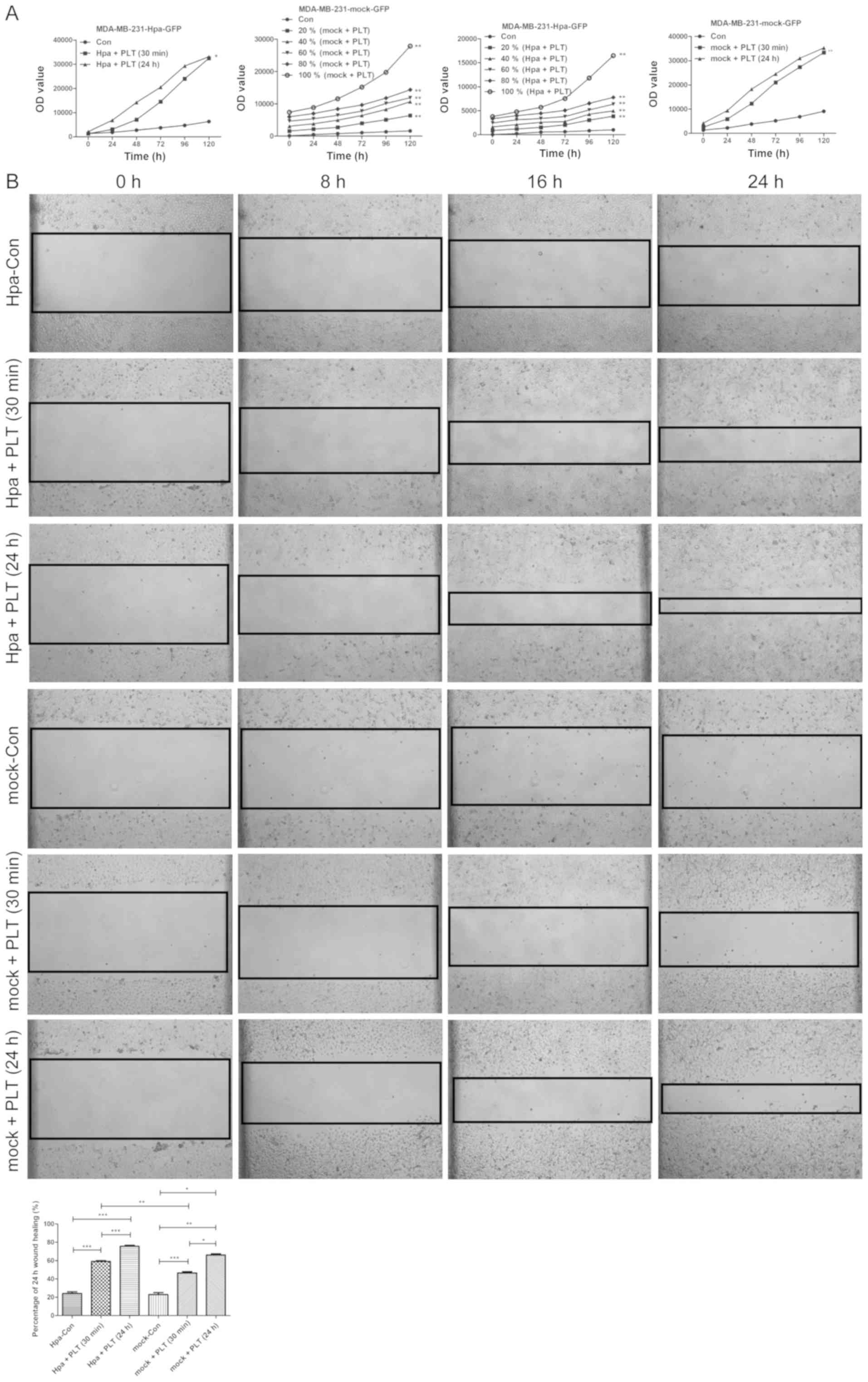 The GFP fluorescence of the MDA-MB-231-Hpa-GFP and MDA-MB-231-mock-GFP cells were tracked every 24 h for 120 h. It was observed that the supernatants (coculture of MDA-MB-231-Hpa-GFP cells and PLT for 30 min/coculture of MDA-MB-231-mock-GFP cells and PLT for 30 min) promoted cell proliferation individually in a concentration- and time-dependent manner: 100% Hpa + PLT (30 min) >80% Hpa + PLT (30 min) >60% Hpa + PLT (30 min) >40% Hpa + PLT (30 min) >20% Hpa + PLT (30 min) >control; 100% mock + PLT (30 min) >80% mock + PLT (30 min) >60% mock + PLT (30 min) >40% mock + PLT (30 min) >20% mock + PLT (30 min) >control. As the proliferation ability of the cells treated with supernatants at a concentration of 20% exhibited a statistically significant difference compared with the control group, the final concentration of 20% was used in the subsequent experiments. In addition, the proliferation ability of the cells cultured with supernatant for 24 h was significantly higher compared with that of cells cultured with supernatant for 30 min: Hpa + PLT (24 h) >Hpa + PLT (30 min); mock + PLT (24 h) >mock + PLT (30 min) (Fig. 5A).