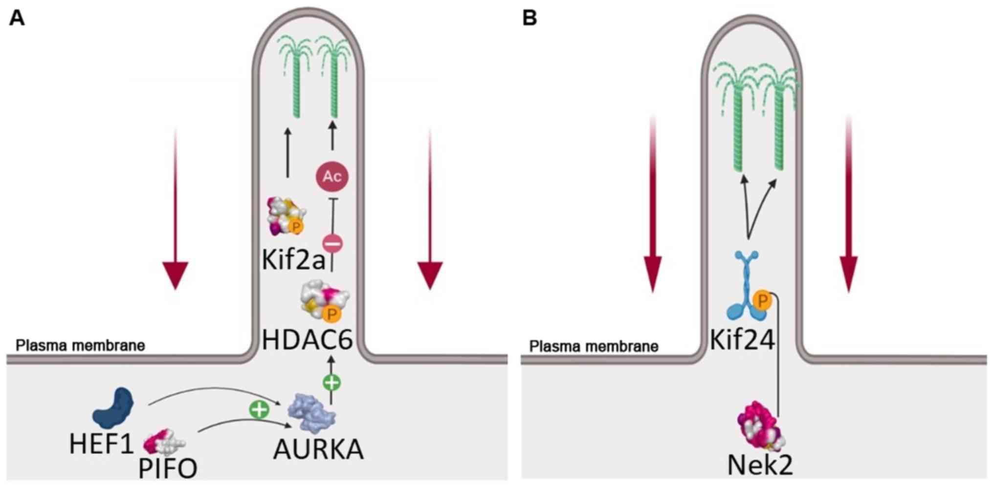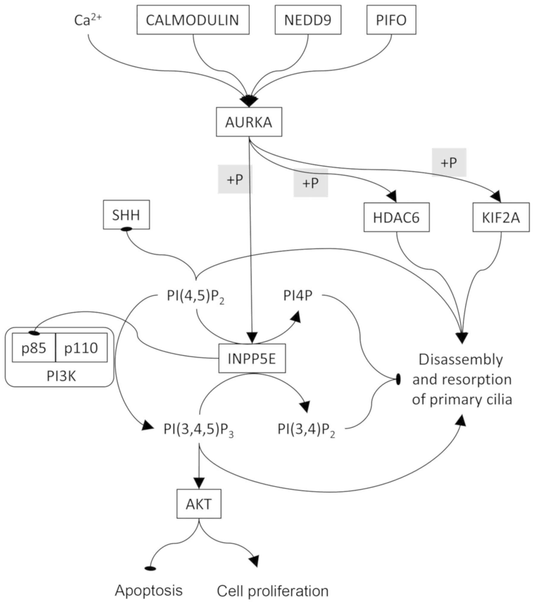 AURKA regulates cell cycle entry and progression to the M phase, as well as ciliary resorption. Additionally, this protein kinase is involved in the mechanism of axonemal disassembly during cell exit from the GO phase. When associated with other proteins, namely HEF1 (NEDD9) and Pitchfork (PIFO), AURKA exhibits increased catalytic activity and induces HDAC6 phosphorylation. This reaction may cause ciliary destabilization and resorption. HEF1 activation of AURKA has been observed after 1-2 h, and after 18-24 h upon treatment with serum, suggesting that the HEF1-AURKA-HDAC6 loop is a key player in ciliary disassembly, even in the first phase of resorption (G1 resorption). However, this phenomenon has yet to be fully elucidated. The role of HDAC6 in ciliogenesis has yet to be clearly determined due to the opposite results of studies on mice with HDAC6 mutations who do not present ciliopathies (8). Furthermore, other AURKA regulators have been identified, such as calmodulin and Ca2+. Inositol polyphosphate-5-phosphatase E (INPP5E), a ciliary lipid phosphatase, removes the 5-phosphate group from PI(3,4,5)3P and PI(4,5) P2, and has been correlated to AURKA activity for the stability of primary cilia. Furthermore, it has been recognized that INPP5E maintains PI(4,5)P2 at low or minimum levels in order to ensure correct trafficking of Hedgehog proteins and, hence, it is implicated in Hedgehog signalling regulation in primary cilia (30-32). The control of the disassembly and resorption of primary cilia is shown in Fig. 2. In particular, AURKA can phosphorylate INPP5E, subsequently increasing its 5-phosphatase activity, and its highest affinity is for PI(3,4,5)P3 (31-33). INPP5E interacts with the p85 subunit of PI3K, leading to the inhibition of the PI3K/AKT signalling pathway (34). In fact, 293 cells stably transfected with the INPP5E gene were found to be highly susceptible to FAS-induced apoptosis and cell growth was suppressed (35). Accumulation of PI(4,5)P2 in the distal half of the cilium led to decapitation by controlling intraciliary F-actin assembly, followed by resorption of the primary cilium (36). PI(4,5)P2 accumulation caused by INPP5E mutations negatively regulates the Sonic Hedgehog (SHH) pathway (32,37,38). However, in order to cause ciliary resorption, it is necessary that AURKA phosphorylates KIF2A and HDAC6 (or HDAC2 in PDAC), but not INPP5E.