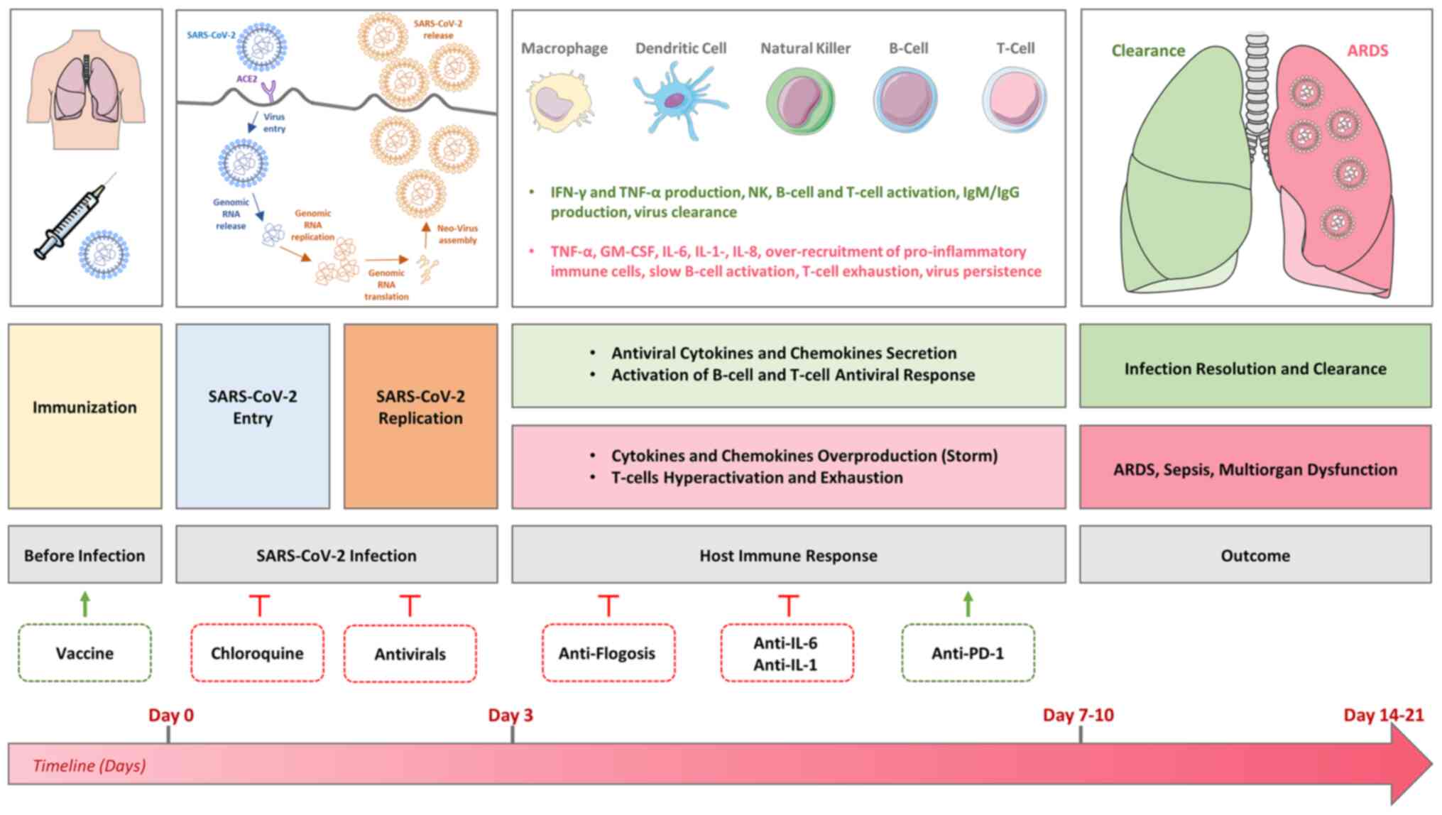 Following SARS-CoV-2 infection, a high rate of immune inflammatory cell infiltration within the alveolar space enhances the local synthesis and secretion of cytokines [interferon (IFN)-α, IFN-β, IFN-γ, tumor necrosis factor (TNF)-α, TGFβ, granulocyte-macrophage colony-stimulating factor (GM-CSF), interleukin (IL)-1β, IL-6, IL-8, IL-12, IL-18, IL-33, etc.] and chemokines (CCL2, CCL3, CCL5, CXCL8, etc.) by immune effector cells, thereby resulting in acute lung injury. If unresolved, this exacerbated production may lead to the so-called 'cytokine storm' (CS) (26). In the near future, it would be crucial to better understand the full dynamics of the cytokine storm kinetics (27).