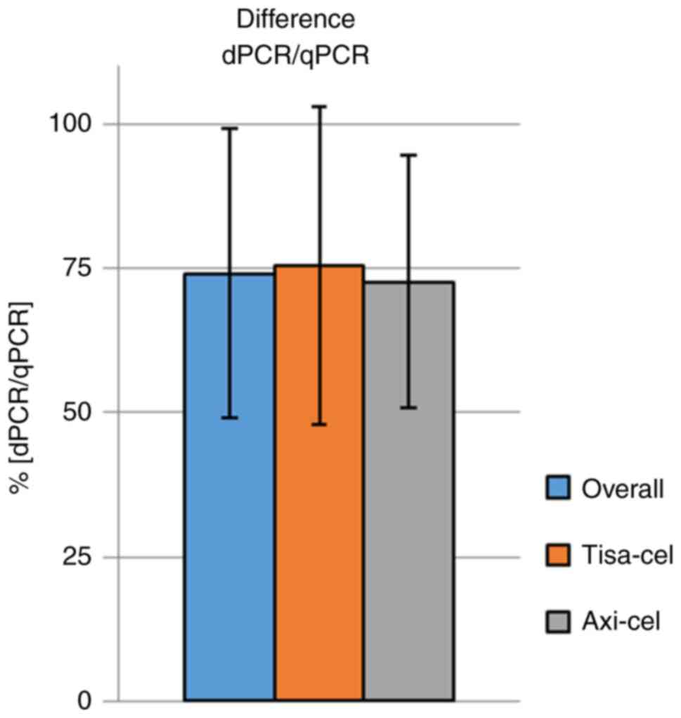 qPCR and dPCR provided very similar quantification results when measuring axi-cel and tisa-cel levels; the resulting high levels of concordance of CAR T cell kinetics assessed with both methods underlines their equal precision.