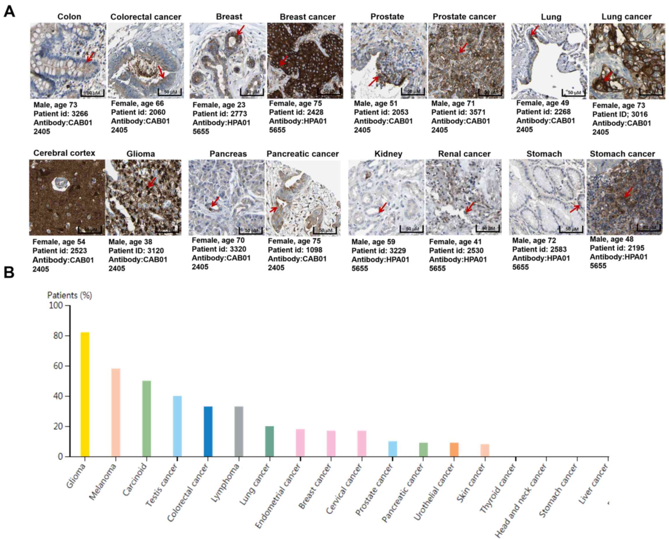 After 20 years of research, DCLK1 is accepted as a specific marker of tuft cells and several types of CSCs and evidence of its ability to regulate tumor growth and metastasis has been provided (9). DCLK1 is expressed in lung, liver, heart, spleen, thymus, prostate and intestine and strongly marks specific cell types (Fig. 1) (10–12). In the present review, the molecular structure and biological mechanisms of DCLK1 in tumorigenesis and metastasis were summarized and its role in metabolism was highlighted as a potentially novel area for further exploration.