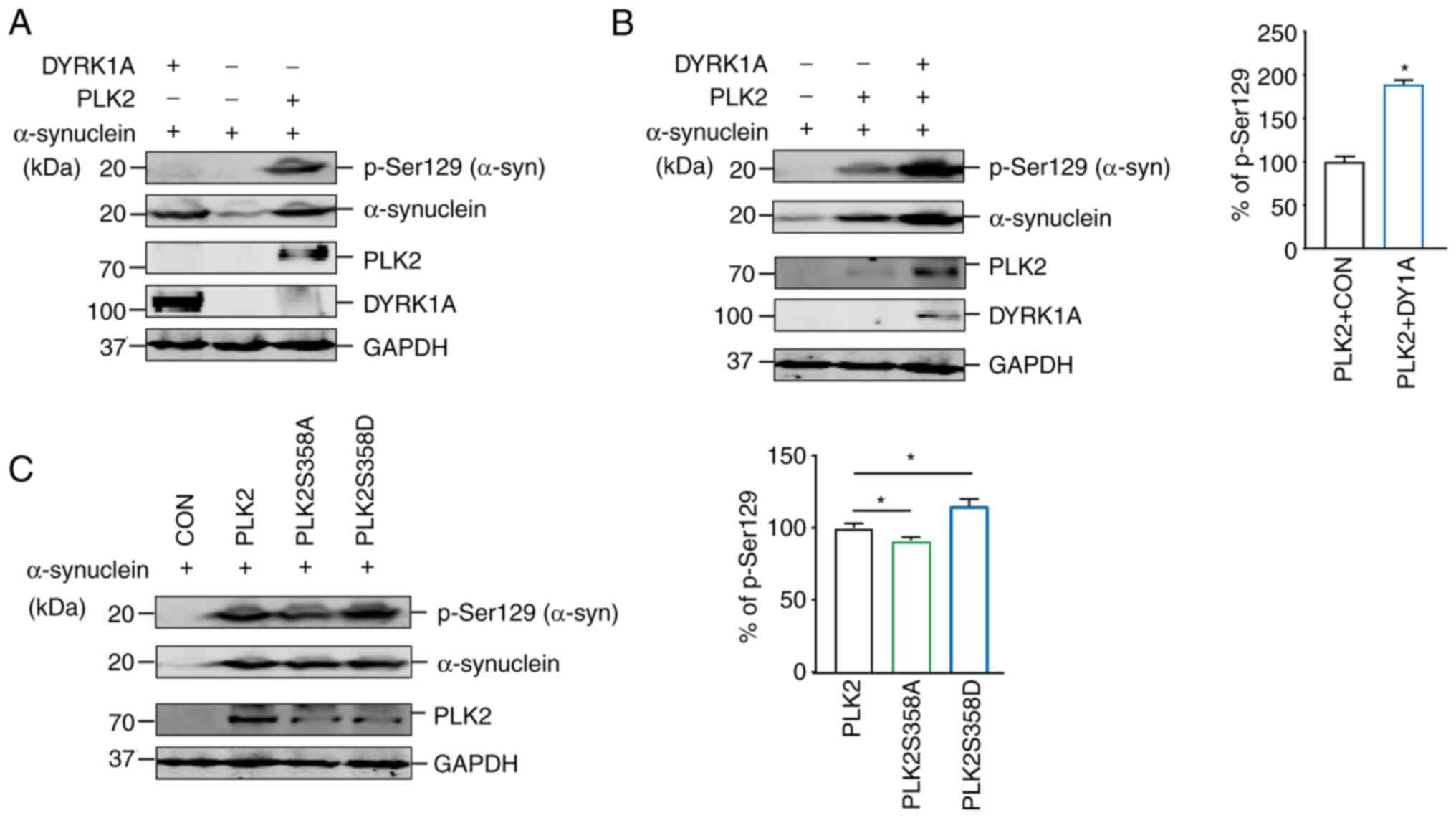 PLK2 kinase activity is vitally crucial for substrate phosphorylation. To investigate whether PLK2 kinase activity was impacted by DYRK1A, PLK2 kinase activity was examined by detecting α-synuclein Ser129 phosphorylation. α-synuclein is widely acknowledged as a specific substrate of PLK2. PLK2 overexpression markedly increases phosphorylation of α-synuclein at Ser129 and promotes abnormal aggregation of α-synuclein (31,32). Hence, α-synuclein Ser129 phosphorylation could be used as an indicator of PLK2 kinase activity. Notably, both DYRK1A and PLK2 increased α-synuclein accumulation compared with the control (Fig. 6A). Consistent with the previous studies (31,32), PLK2 robustly induces α-synuclein Ser129 phosphorylation. However, DYRK1A introduction alone was not able to induce α-synuclein Ser129 phosphorylation (Fig. 6A). Notably, α-synuclein Ser129 phosphorylation was significantly increased in the presence of both PLK2 and DYRK1A compared with PLK2 alone (Fig. 6B). This result suggested that the increase in α-synuclein Ser129 phosphorylation may be attributed to the enhancement of PLK2 activity induced by DYRK1A. Further analysis using phosphorylation-null mutant PLK2 S358A and phosphorylation-mimicking mutant PLK2 S358D was applied for comparison. Compared with wild-type PLK2, PLK2 S358A had significantly reduced α-synuclein Ser129 phosphorylation. Conversely, PLK2 S358D significantly elevated α-synuclein Ser129 phosphorylation (Fig. 6C). Taken together, these data demonstrated that Ser358 of PLK2 is critical for PLK2 kinase activity and can be modulated by DYRK1A.