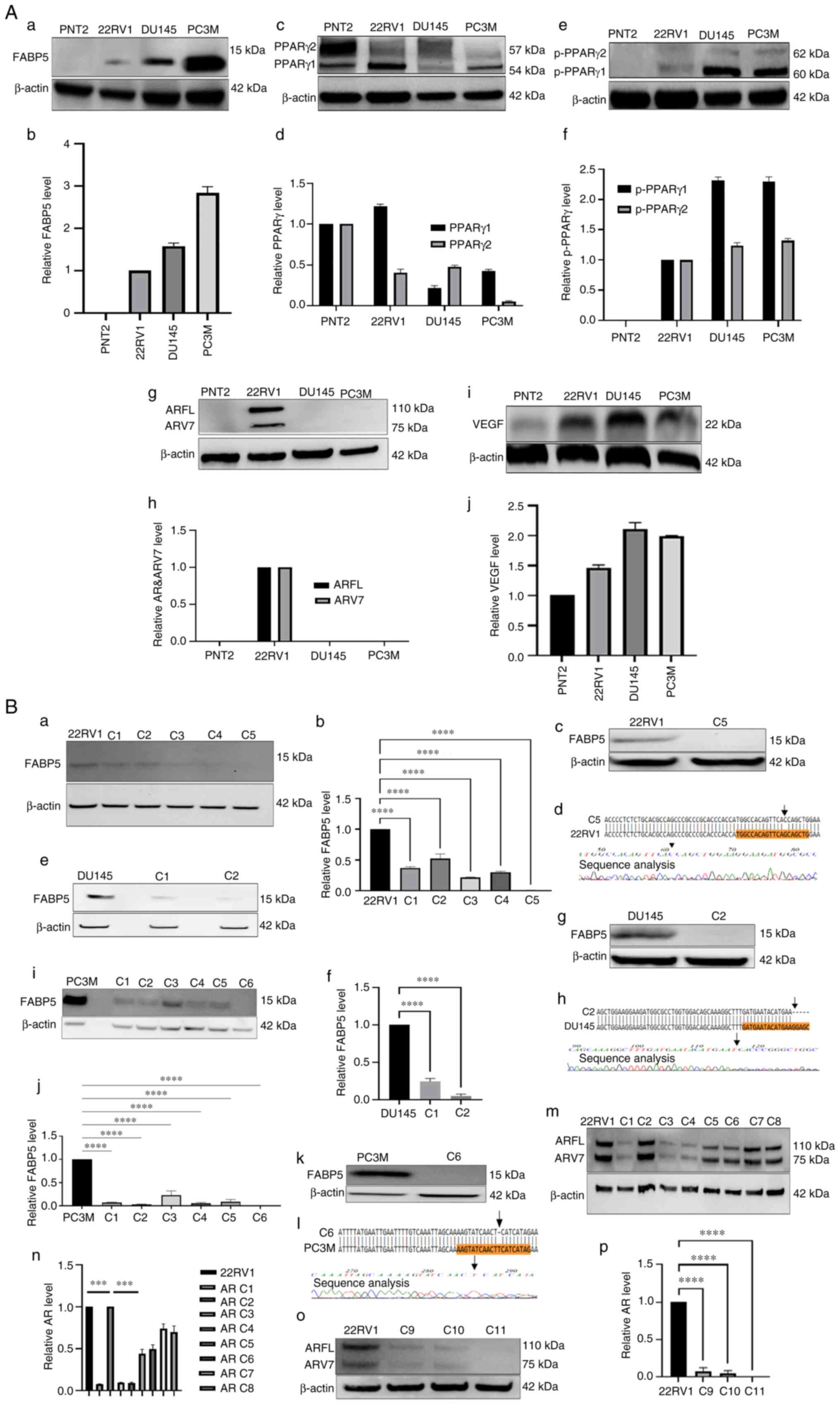 Figure 1Western blot analysis of some key proteins associated with the FABP5 pathway in benign and malignant prostate cells, and western blot analysis was combined with DNA-sequencing analysis to verify the successful gene KO cell clones. An anti-β-actin antibody was incubated with each blot to standardize the immunological responses. Quantitative analysis was performed by densitometrical scanning of the area and peak of each band on the blot. The protein relative levels were reproduced independently three times, and the differences were assessed by Student's t-test for results with 2 datasets, and one-way ANOVA test for results with 3 or more datasets. Dunnett's post hoc test was utilized for multiple comparisons following the ANOVA. (A) Relative expression of FABP5 pathway-associated proteins in benign and malignant prostate epithelial cells is shown. a) Western blot analysis of FABP5 in benign PNT2 cells, the moderately malignant 22RV1 cells, and the highly malignant prostate carcinoma cell lines, DU145 and PC3M. b) Relative levels of FABP5 protein in PNT2, 22RV1, DU145 and PC3M cells. The level of FABP5 in 22RV1 cells was set at '1', and the levels in DU145 and PC3M were obtained by comparing with that of 22RV1. c) Western blot detection of PPARγ in PNT2, 22RV1, DU145 and PC3M cells. d) Relative levels of PPARγ in PNT2, 22RV1, DU145, and PC3M cells. The level in PNT2 cells was set at '1', and the levels in the other cell lines were obtained by comparing with that of PNT2. e) Western blot analysis of pPPARγ in PNT2, 22RV1, DU145 and PC3M cells. f) Relative levels of pPPARγ in PNT2, 22RV1, DU145, and PC3M cells. The level in 22RV1 cells was set at '1', and levels in DU145 and PC3M were obtained by comparing with that of 22RV1. g) Western blot analysis of ARFL protein in PNT2, 22RV1, DU145 and PC3M cells. h) Relative levels of ARFL in prostate cell lines. The level of ARFL in 22RV1 cells was set at '1', and levels in the other cell lines were not detectable. i) Western blot analysis of VEGF protein in PNT2, 22RV1, DU145 and PC3M cells. j) Relative levels of VEGF; the level in PNT2 was set at '1', and levels in the other cell lines were obtained by comparing with that of PNT2. (B) Western blot and DNA sequencing analyses were performed to verify successful gene suppression in KO cell clones. a) Western blots of FABP5 protein in 22RV1 cells and its derivative FABP5-KO clones. b) Relative levels of FABP5 in 22RV1 cells and in its derivative FABP5-KO clones. The level of FABP5 in 22RV1 cells was set at '1', and levels in different clones were obtained by comparing with that in 22RV1. c) Further Western blots of FABP5 protein in 22RV1 cells and in the successful FABP5-KO clone C3. d) DNA sequence analysis revealed the location where the guide RNA-induced mutation occurred (depicted by the black arrow). e) Western blot analysis of FABP5 protein in DU145 cells and in its derivative FABP5-KO clones. f) Relative levels of FABP5 in DU145 and in the different FABP5-KO clones. The level of FABP5 in DU145 was set at '1', and the levels in the different clones were obtained by comparing with that in DU145. g) Western blot analysis of FABP5 protein in DU145 cells and in a selected FABP5-KO clone (C2). h) DNA sequence analysis revealed the location where the guide RNA-induced mutation occurred (depicted by the black arrow). i) Western blot detection of FABP5 expression in PC3M and in different FABP5-KO clones. j) Relative levels of FABP5 in PC3M and in its different FABP5-KO clones. The level of FABP5 in PC3M was set at '1', and the levels in its different FABP5-KO clones were obtained by comparing with that in PC3M. k) Western blot analysis of FABP5 protein in PC3M and in its selected FABP5-KO clone, C6. l) DNA sequence analysis revealed the location where the guide RNA-induced mutation occurred (depicted by the black arrow). m) Western blot analysis of AR protein in 22RV1 cells and in its different AR-KO clones. n) Relative levels of AR in 22RV1 cells and in its AR-KO clones. The level of AR in 22RV1 was set at '1', and the levels of AR in different clones were obtained by comparing with that in 22RV1. o) Western blot analysis of AR expression in 22RV1 cells and in its AR-KO clones. p) Relative levels of AR in 22RV1 and in its AR-KO clones. The level of AR in 22RV1 was set at '1', and the levels of AR in different clones were obtained by comparing with that in 22RV1 cells. ***P<0.0001 and ****P<0.00001. KO, knockout; FABP5, fatty acid-binding protein 5; AR, androgen receptor; PPARγ, peroxisome proliferator-activated receptor-γ; VEGF, vascular endothelium growth factor; pPPARγ, phosphorylated PPARγ; ns, not statistically significant. |