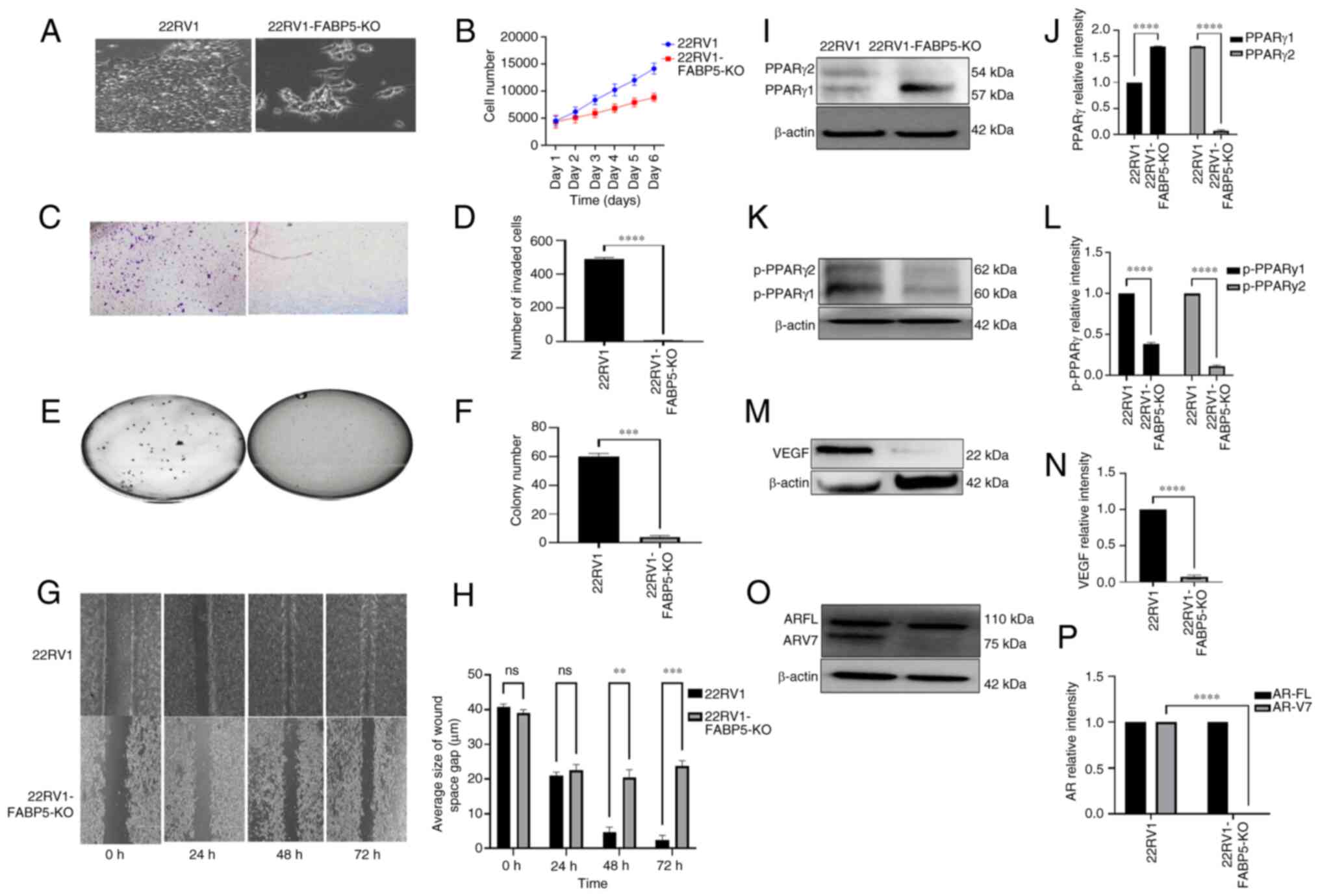 Figure 2Effect of FABP5-KO on malignant characteristics of 22RV1 cells and on the levels of downstream proteins of the FABP5 signaling pathway. (A) Microscopical appearances of 22RV1-FABP5-KO cells and their parental 22RV1 cells. (B) Effect of FABP5-KO on proliferation of 22RV1 cells. C) Effect of FABP5-KO on invasion of 22RV1 cells. (D) Quantitative assessment of the numbers of invasive cells. (E) Effect of FABP5-KO on anchorage-independent growth of 22RV1 cells. (F) Quantitative assessment on cell colony numbers formed in soft agar. (G) Effect of FABP5-KO on motility of 22RV1 cells. (H) Quantitative assessment of the average wound width of the space of the gap (μm) at different times is shown. (I) Western blot analysis of PPARγ1 and PPARγ2 in 22RV1 and in 22RV1-FABP5-KO cells. (J) Relative levels of PPARγ1 and PPARγ2. The levels of PPARγ1 and PPARγ2 in 22RV1 cells were each set at '1', and their levels in 22RV1-FABP5-KO cells were obtained by comparing with those in 22RV1. (K) Western blot analysis of pPPARγ1 and pPPARγ2 in 22RV1 and in 22RV1-FABP5-KO cells. (L) Relative levels of pPPARγ1 and pPPARγ2. The levels of pPPARγ1 and pPPARγ2 in 22RV1 were each set at '1', and those in 22RV1-FABP5-KO cells were obtained by comparing with those in 22RV1. (M) Western blot analysis of VEGF in 22RV1 and in 22RV1-FABP5-KO cells. (N) Relative levels of VEGF protein. The level of VEGF in 22RV1 cells was set at '1', and the level of VEGF in 22RV1-FABP5-KO cells was obtained by comparing with that in 22RV1. (O) Western blot analysis of ARFL and ARV7 in 22RV1 and in 22RV1-FABP5-KO cells. (P) Relative levels of ARFL and ARV7. Levels of ARFL and ARV7 in 22RV1 cells were set at '1', and the levels of ARFL and ARV7 in 22RV1-FABP5-KO cells were obtained by comparing with those in 22RV1. The protein relative levels were reproduced independently three times, and the differences were assessed by Student's t-test. Results were considered significant when P<0.05. **P<0.001, ***P<0.0001 and ****P<0.00001. KO, knockout; FABP5, fatty acid-binding protein 5; AR, androgen receptor; ARFL, full-length AR; ARV7, AR splicing variant 7; PPARγ, peroxisome proliferator-activated receptor-γ; pPPARγ, phosphorylated PPARγ; ns, not statistically significant. |